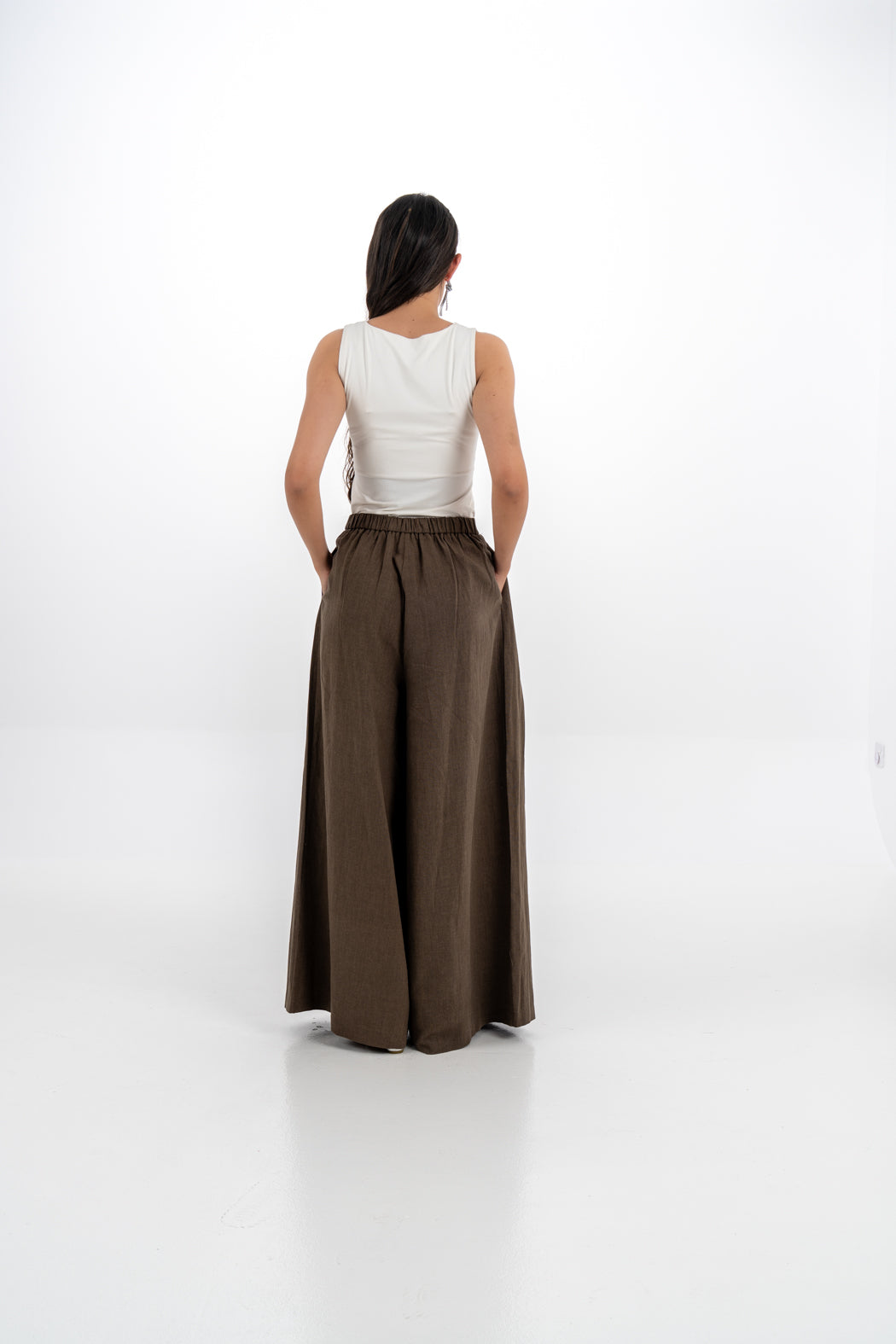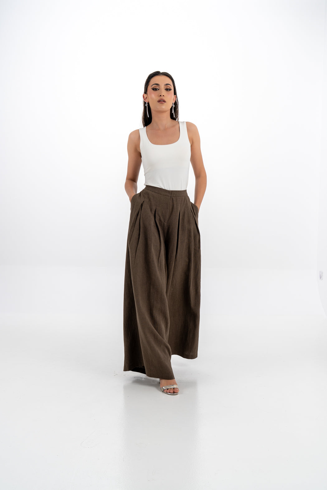 تميّزي بإطلالة أنيقة مع هذا البنطال الواسع المصمم بأرجل واسعة وطيات أمامية وخصر عالٍ جذاب. يتميز بسهولة الارتداء بفضل الشريط المطاطي في الخلف وعدم وجود سحّاب. مثالي للإطلالات اليومية أو الرسمية عند تنسيقه مع توب ضيق أو بدون أكمام.