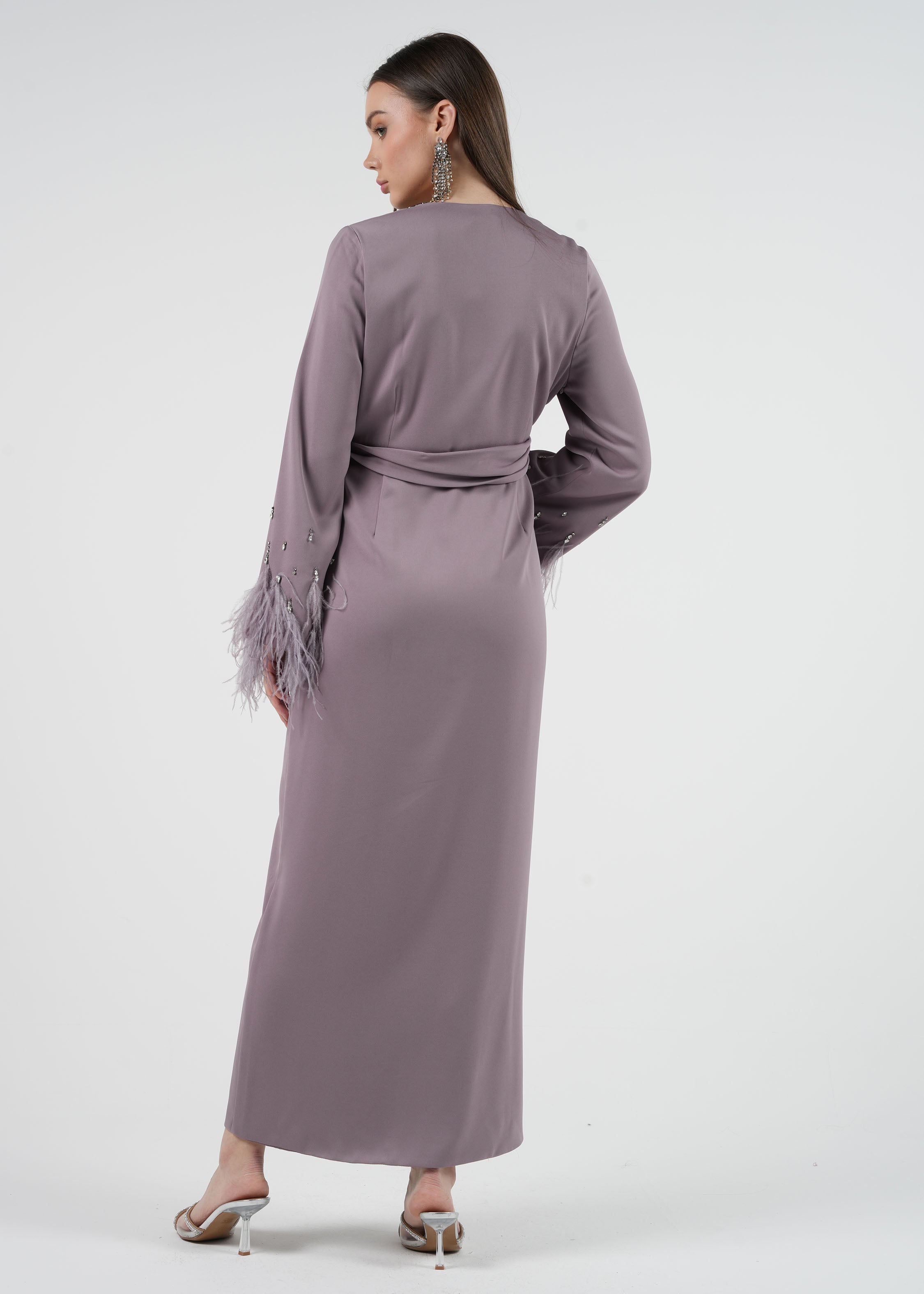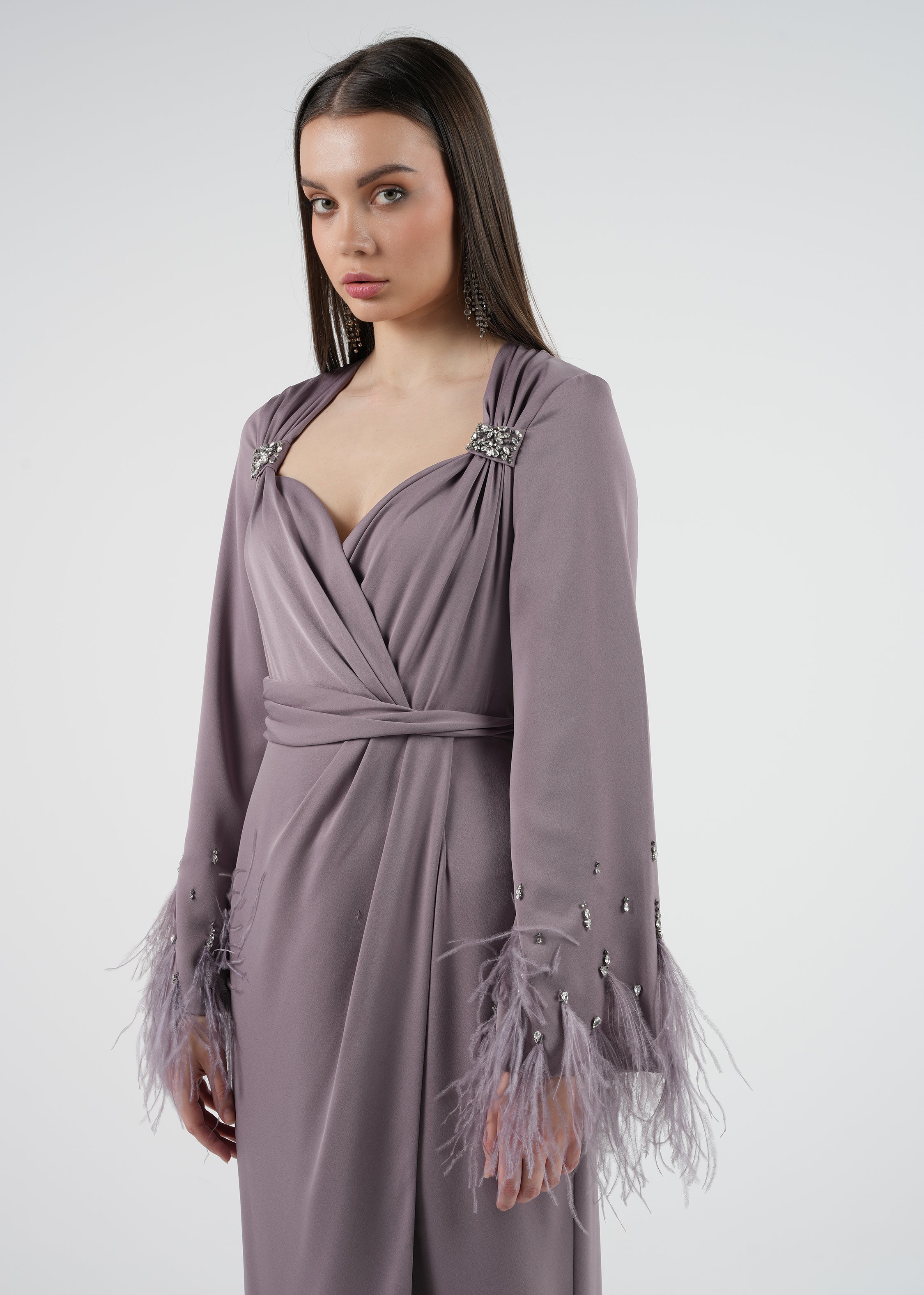 تألقي بإطلالة راقية مع فستان ماكسي أنيق بأكمام مزينة بالريش والكريستال اليدوي، يتميز بياقة أنيقة على شكل قلب مزينة بتفاصيل كريستالية يدوية فاخرة. الأكمام الطويلة مزينة بريش فاخر مع لمسات كريستالية متقنة تضيف لمسة من الفخامة والجاذبية. يمنحك التصميم المحدد عند الخصر إطلالة أنثوية جذابة، مما يجعله الخيار الأمثل للمناسبات الرسمية والسهرات.