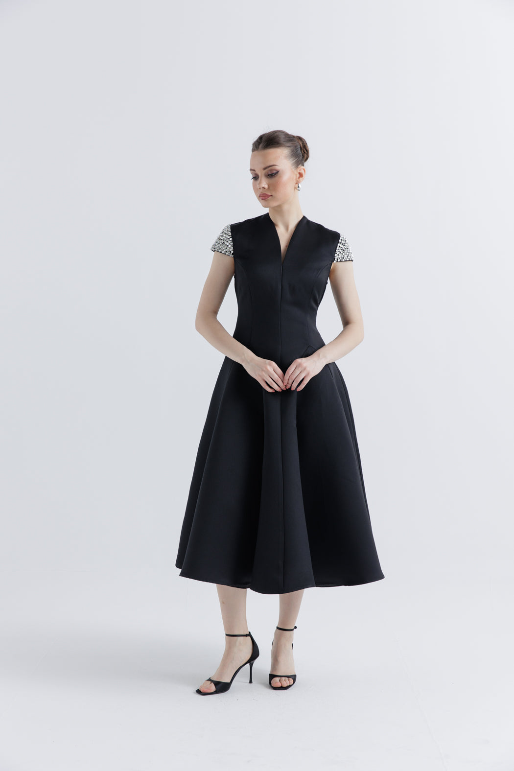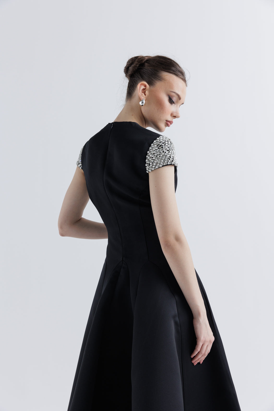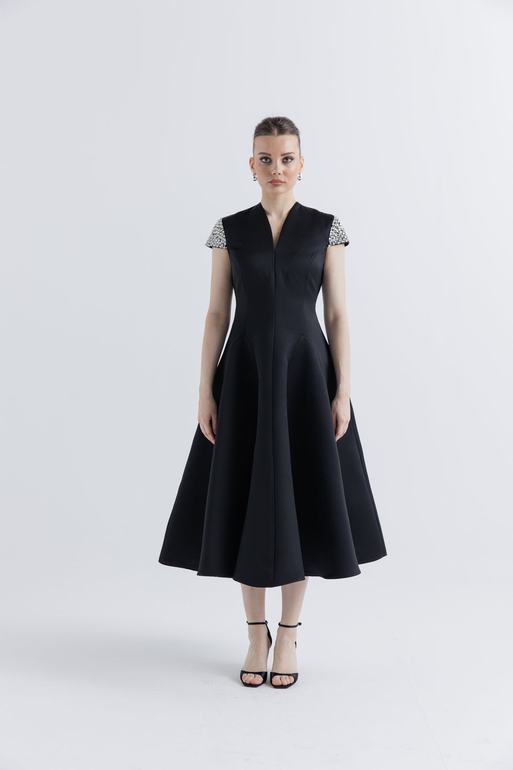 ارتقي بإطلالتك المسائية مع هذا الفستان الميدي المصمم بعناية ليبرز جمال القوام ويخطف الأنظار بتفاصيله المتقنة. تم تصنيعه من قماش فاخر وذو بنية متماسكة، ويتميز بياقة على شكل V وخياطة دقيقة تمنح الجسم مظهراً أنيقاً. تلفت الأنظار الأكمام القصيرة المرصعة يدوياً بالكريستال البراق، لتضفي لمسة فاخرة مثالية للمناسبات الخاصة. التصميم المتسع من الأسفل يضفي انسيابية ورقياً، بينما يوفر السحاب الخلفي الخفي إطلالة أنيقة ومريحة.