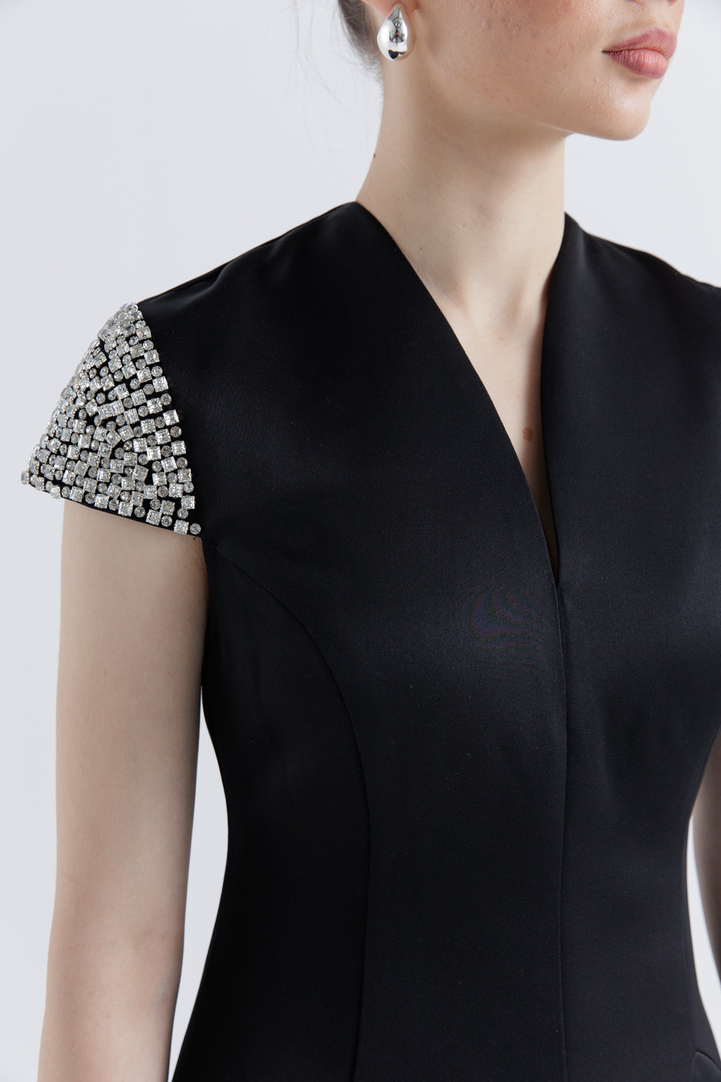 • التصميم: ياقة V، قصة ضيقة من الأعلى وواسعة من الأسفل، أكمام قصيرة مرصعة بالكريستال يدوياً