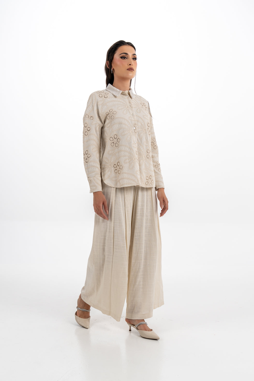 استمتعي بالأناقة الكلاسيكية مع هذا القميص المصنوع من مزيج القطن والمزين بتطريزات دقيقة على شكل ورود ونقشات نباتية مفرغة. يتميز بياقة لامعة تضيف لمسة فخمة على التصميم الطبيعي البسيط. يأتي بأزرار أمامية وأكمام طويلة مع قصّة مريحة تناسب الإطلالات اليومية والرسمية.