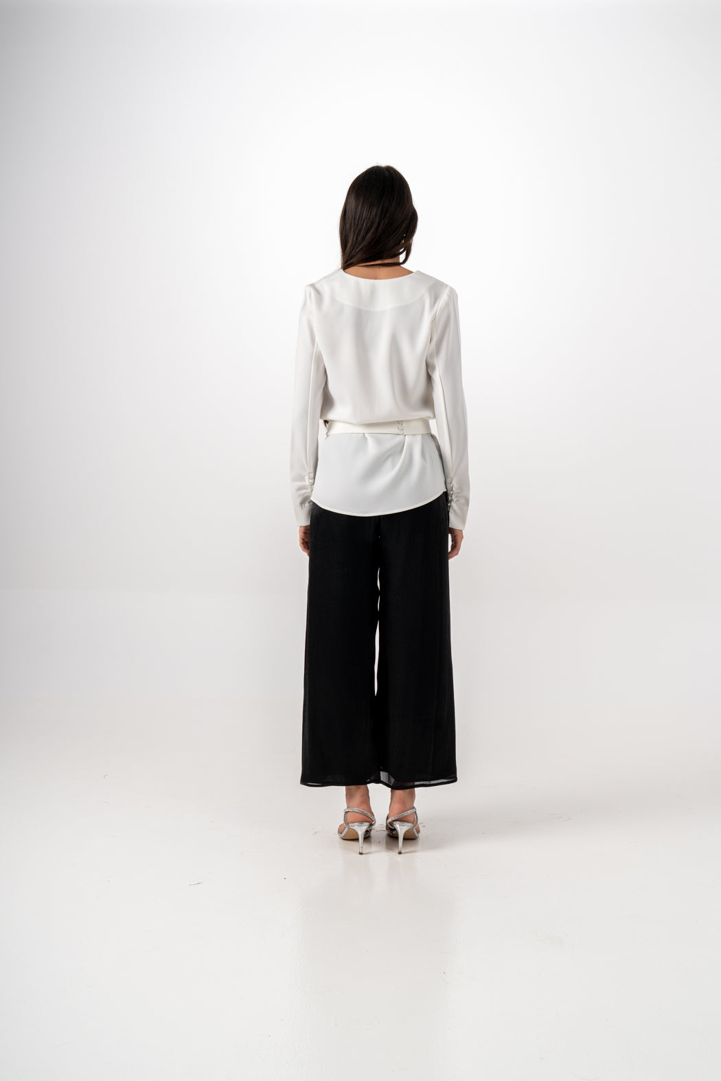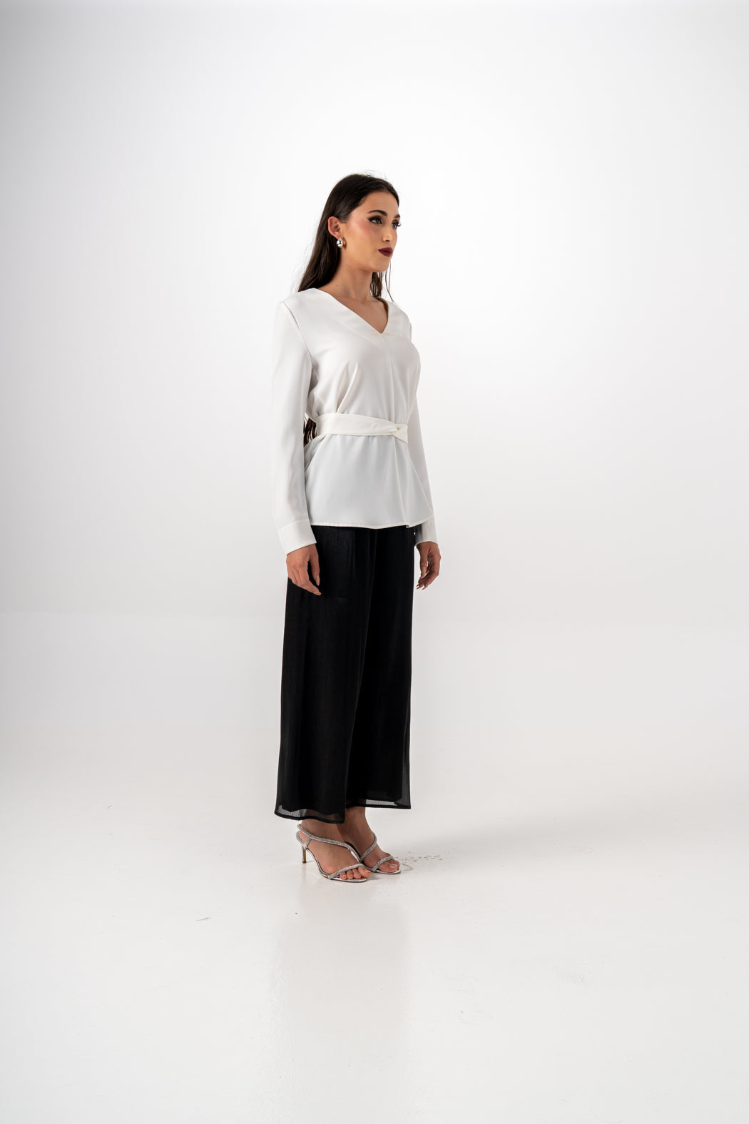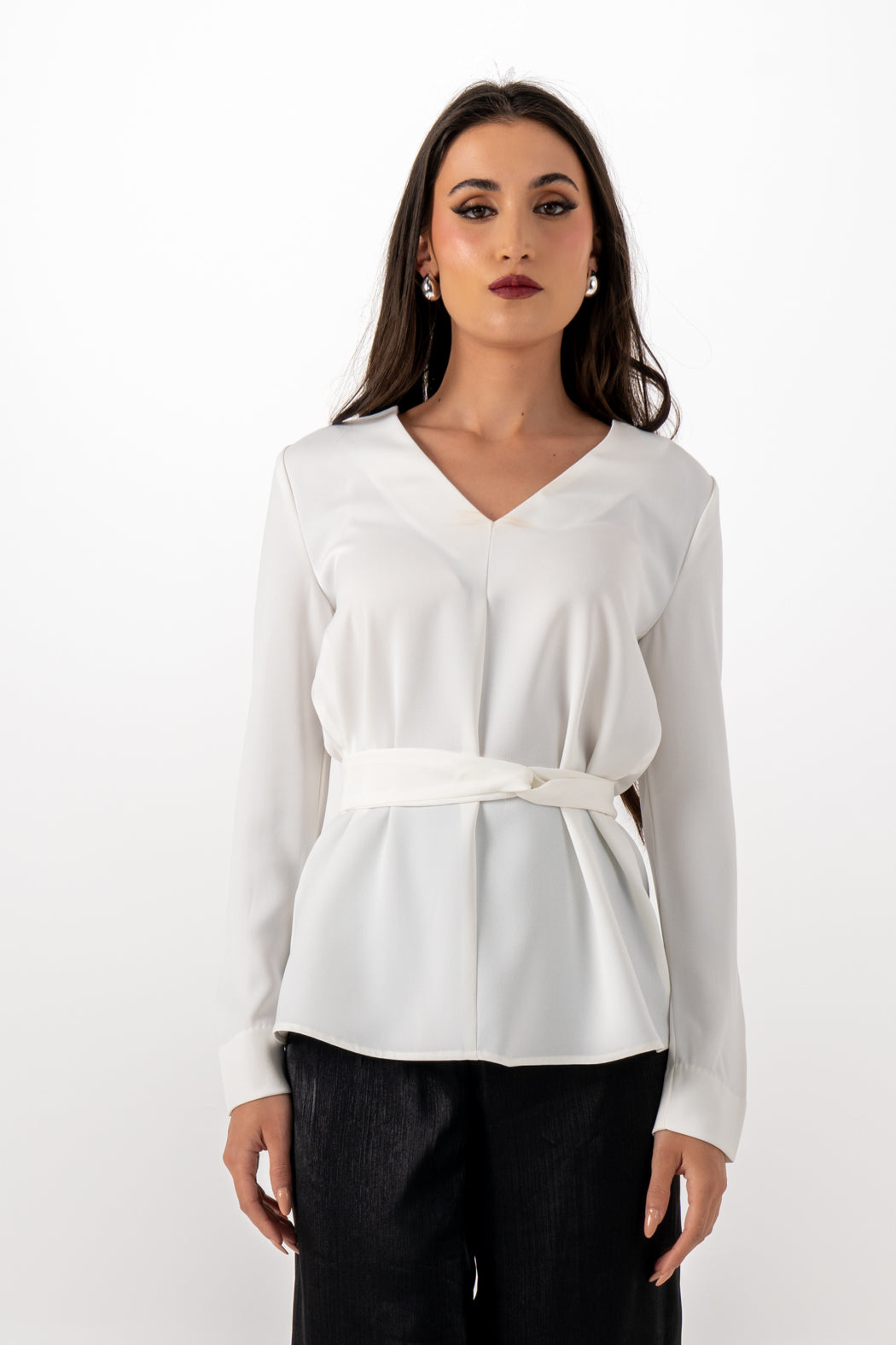 تألقي بأسلوب راقٍ مع هذه البلوزة البسيطة التي تجمع بين الأناقة والراحة. تتميز بياقة V ناعمة وقَصّة انسيابية مع حزام قابل للفك يبرز جمال الخصر. بأكمام طويلة وتفاصيل دقيقة، تُعد خياراً مثالياً للمناسبات الرسمية والإطلالات اليومية. يبلغ طول البلوزة حوالي 70 سم، ويمكن تنسيقها مع التنورة 2501019 لإطلالة متكاملة.
