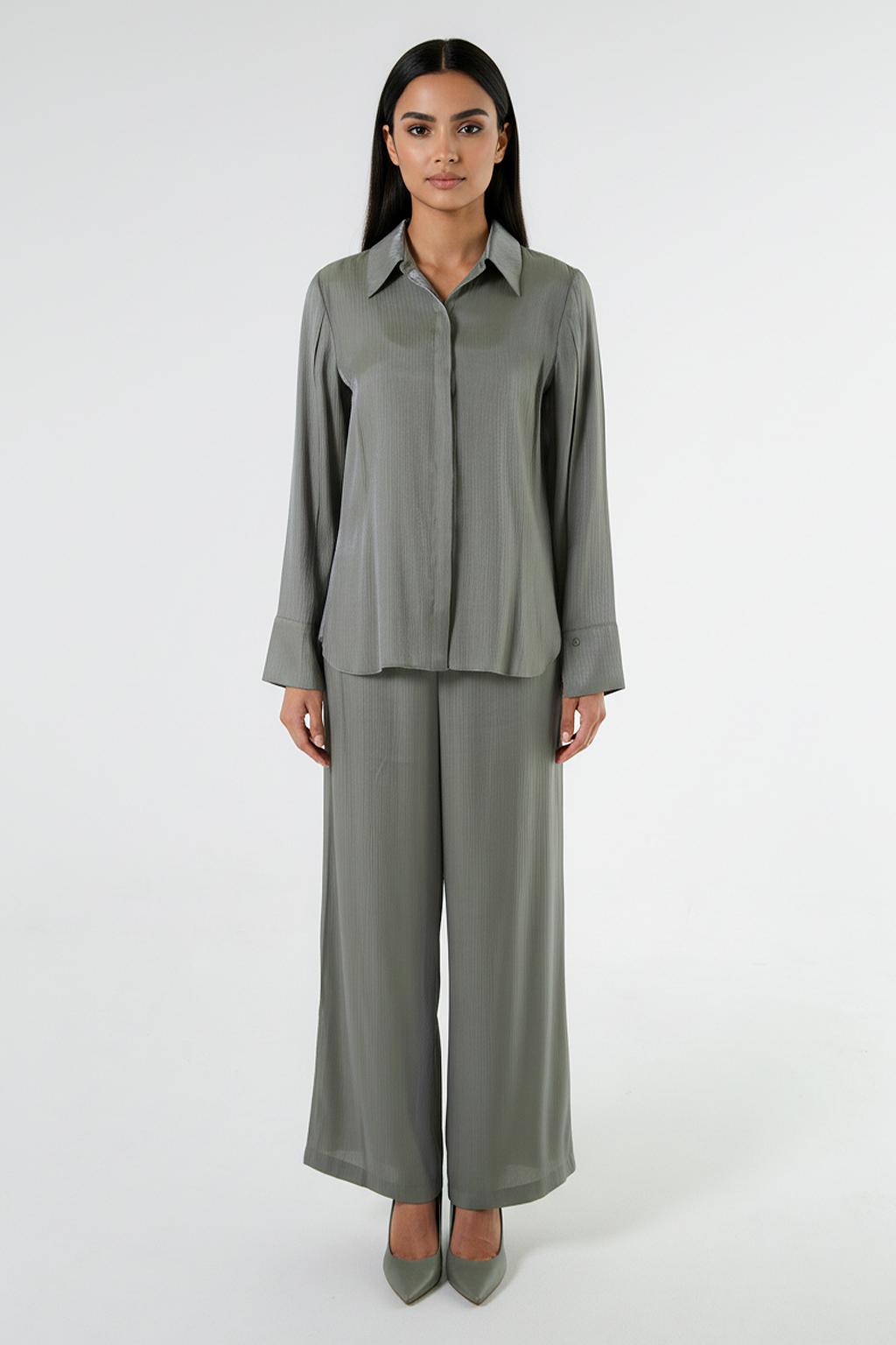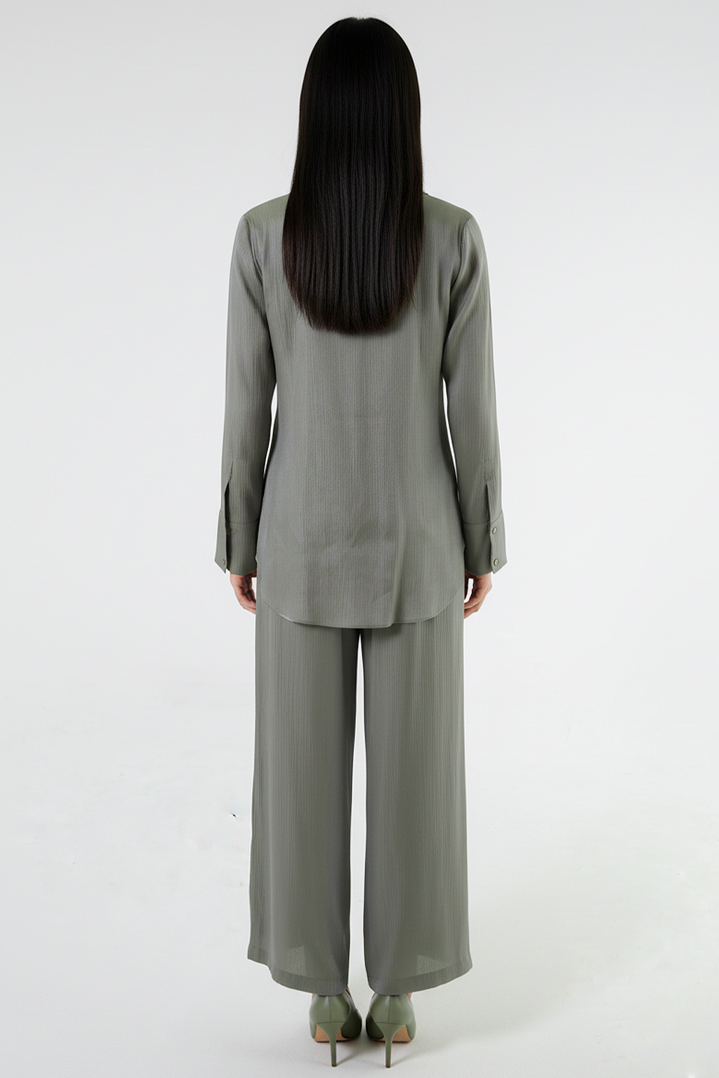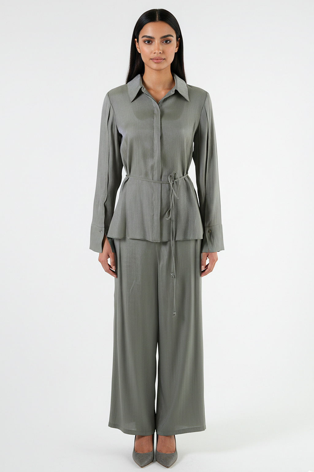 يأتي القميص بياقة كلاسيكية مدببة، وأكمام طويلة مزودة بأساور مُحكمة مع أزرار، بالإضافة إلى تقليم أمامي مخفي لإطلالة نظيفة وبسيطة. يتضمن القميص حزامًا من نفس الخامة يمنحكِ حرية تحديد الخصر بشكل أنثوي وأنيق، أو ارتدائه بدون الحزام لإطلالة مريحة وبسيطة. ينسياب الجزء الخلفي بتصميم أطول ليضفي حركة سلسة ومظهرًا عصريًا راقيًا.