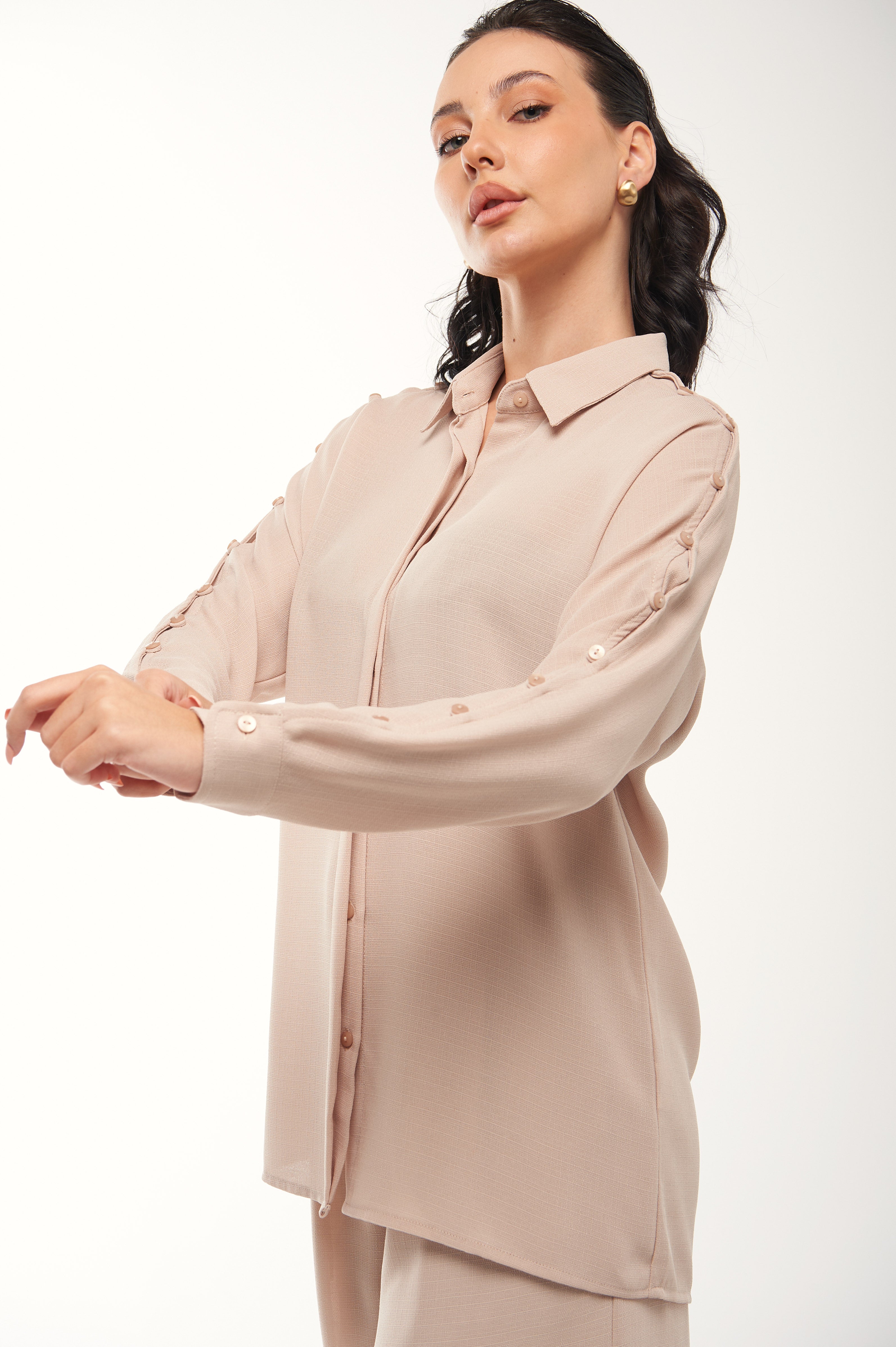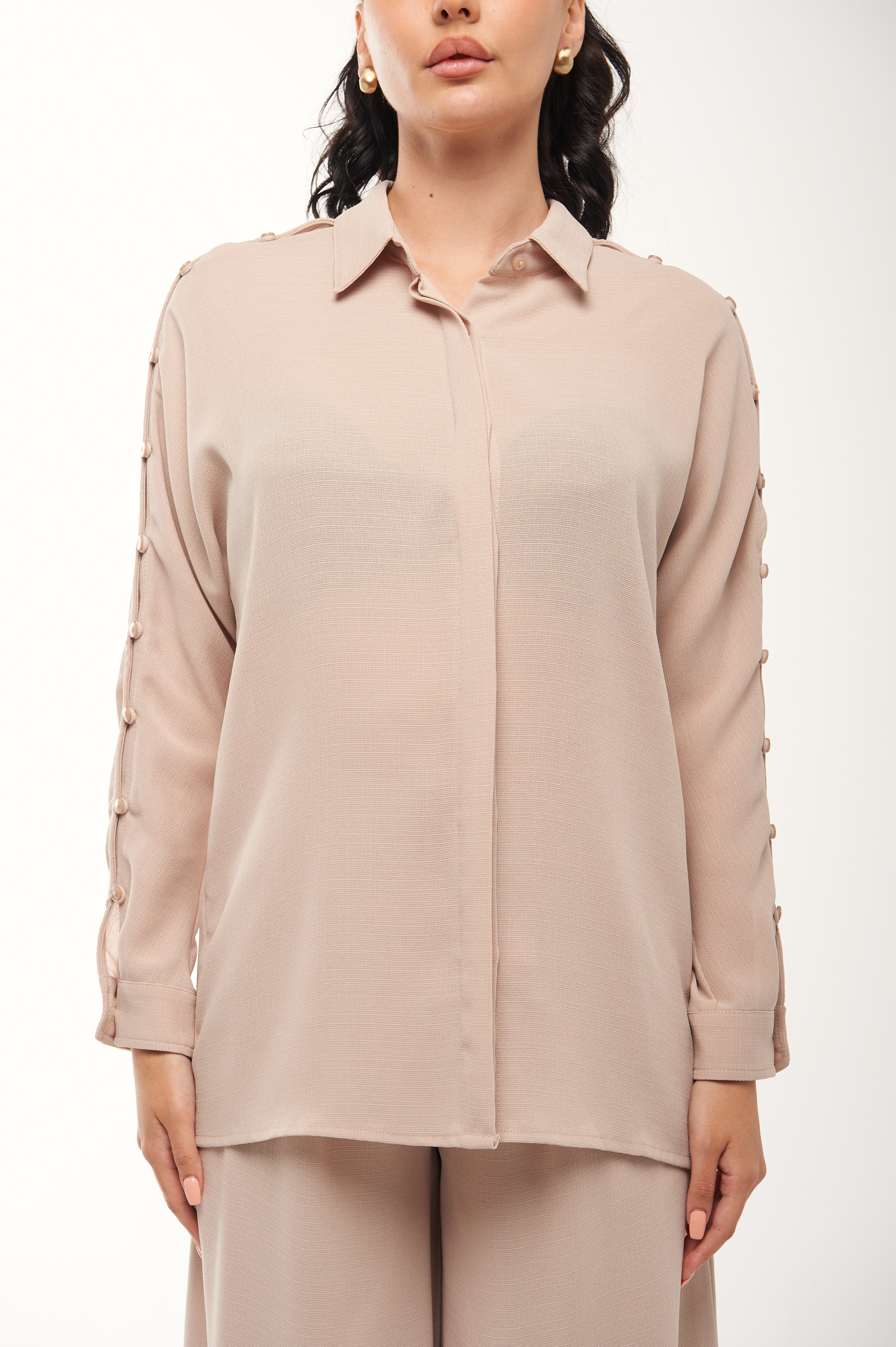 يجمع هذا القميص الأنيق بين التصميم الكلاسيكي واللمسات العصرية، مع أزرار تزيينية أنيقة على الأكمام وسديلة أمامية مخفية لمظهر ناعم ومرتب. يتميز بقصة مريحة وواسعة تناسب الإطلالات اليومية أو الرسمية. يمكنك تنسيقه بكل سهولة مع البنطال المطابق (كود: 2404056) لإطلالة متناسقة وعصرية.