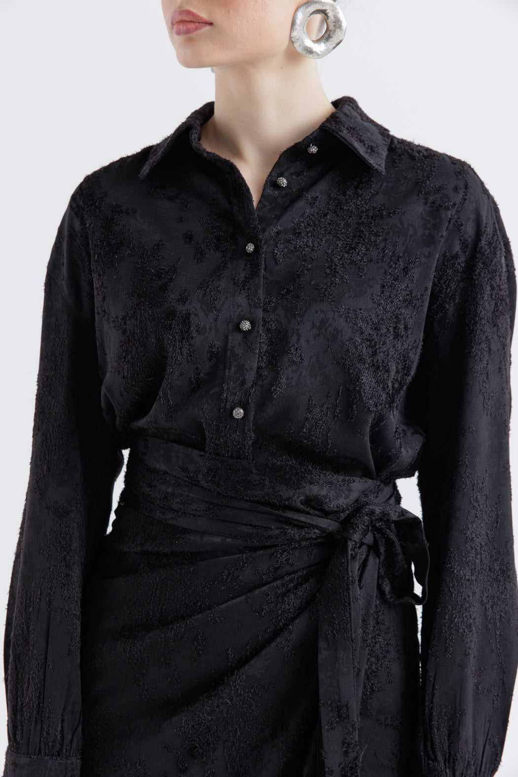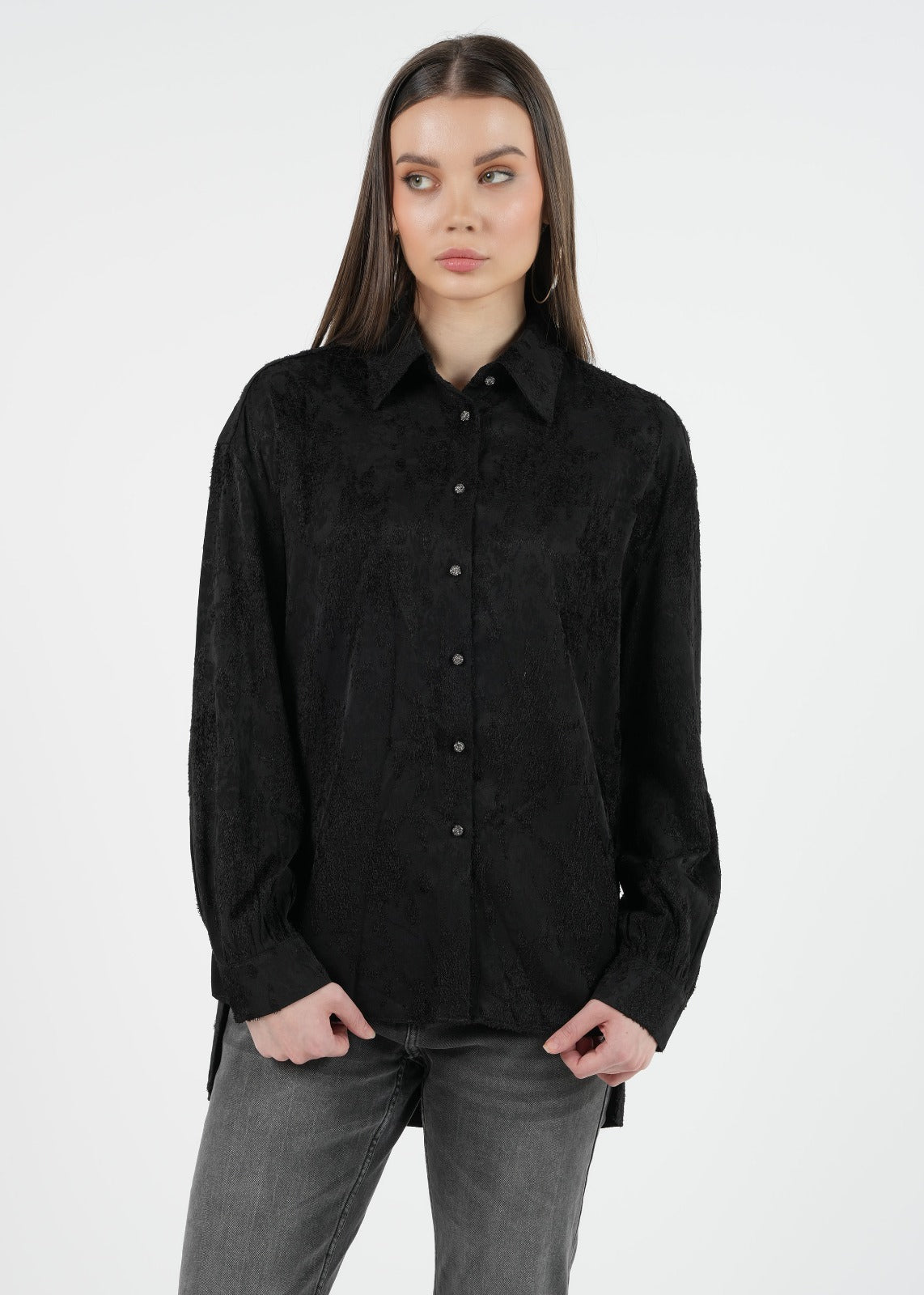 يجمع هذا القميص الأسود المزخرف بين الأناقة الكلاسيكية والتصميم العصري، مع أزرار مرصعة بالأحجار تضيف لمسة راقية من الفخامة. يتميز بقصّة هاي لو حيث يكون أقصر من الأمام وأطول من الخلف، مما يمنح إطلالة أنيقة وانسيابية. مع تصميم مريح وطول أمامي يبلغ حوالي 67 سم (المقاس S)، فهو الخيار المثالي للإطلالات الرسمية وغير الرسمية.
