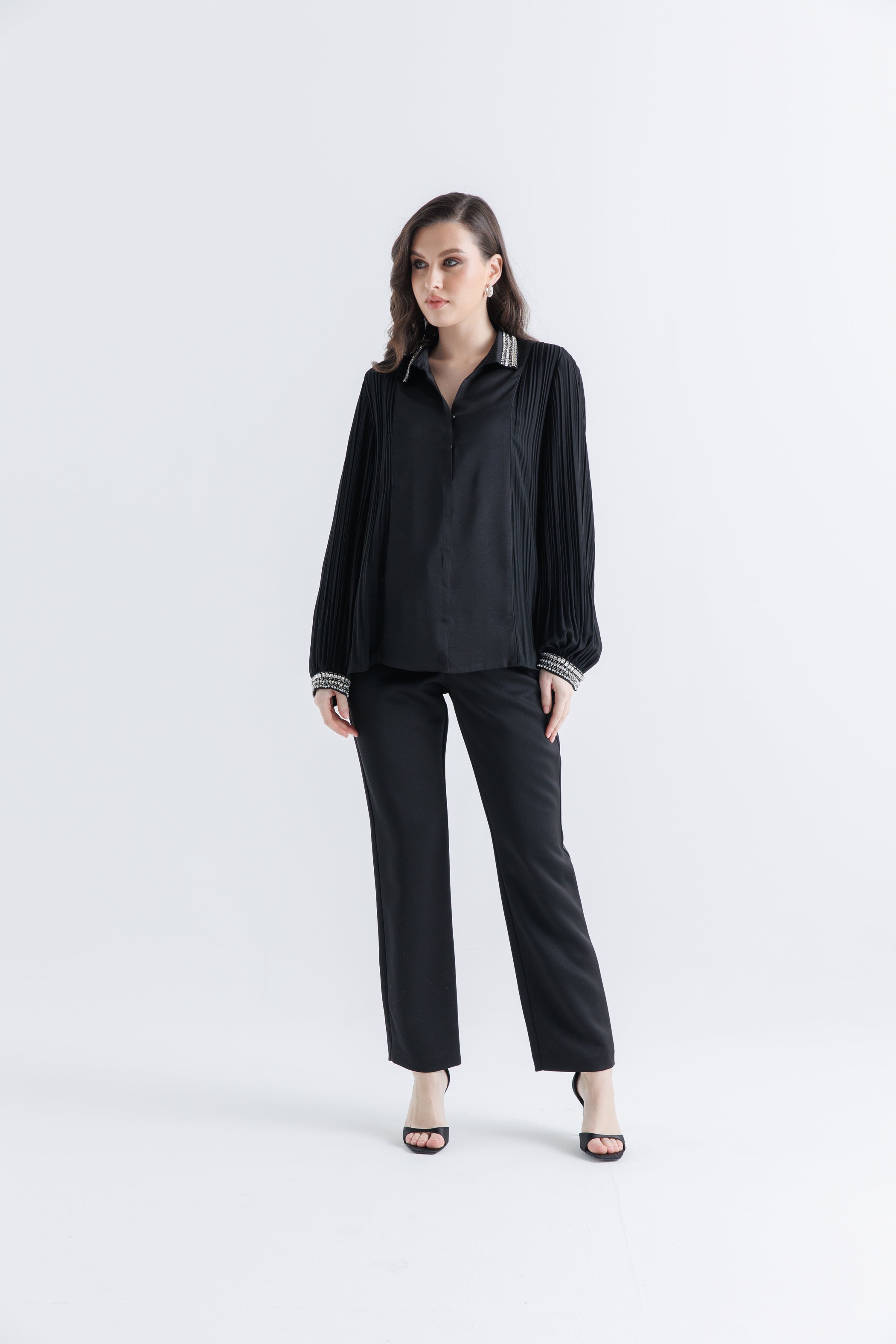 ✔ التطريز: تفاصيل فاخرة من الخرز والكريستال على الياقة والأكمام لمظهر أنيق ومتألق.