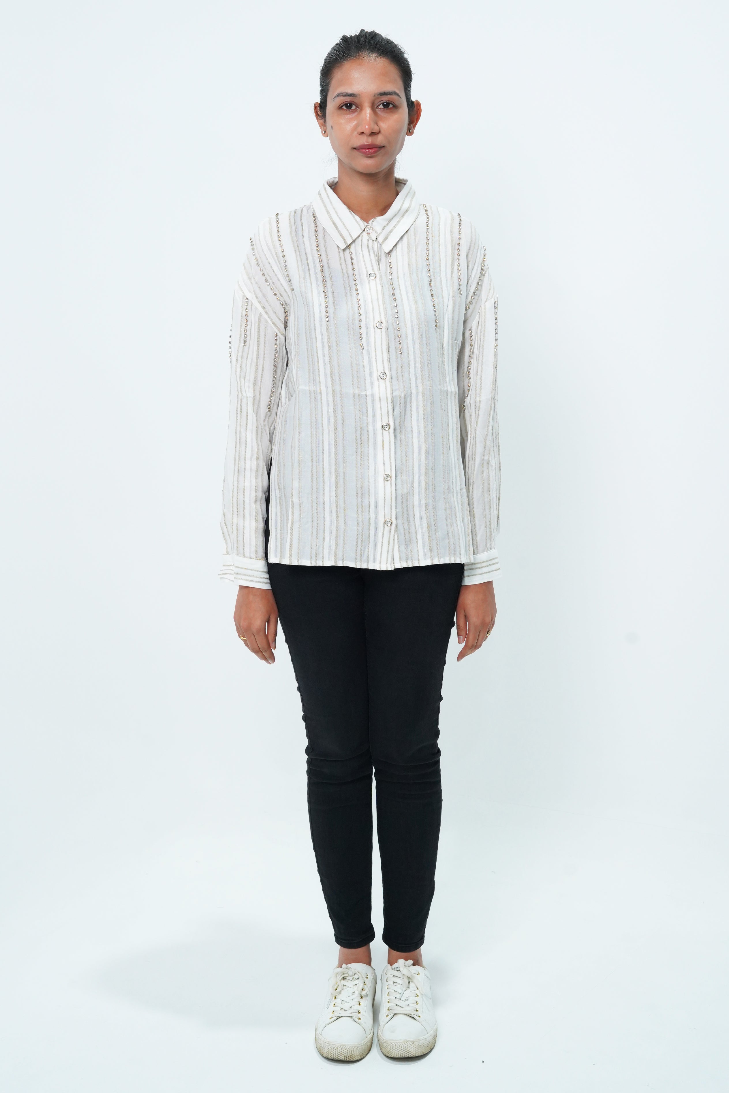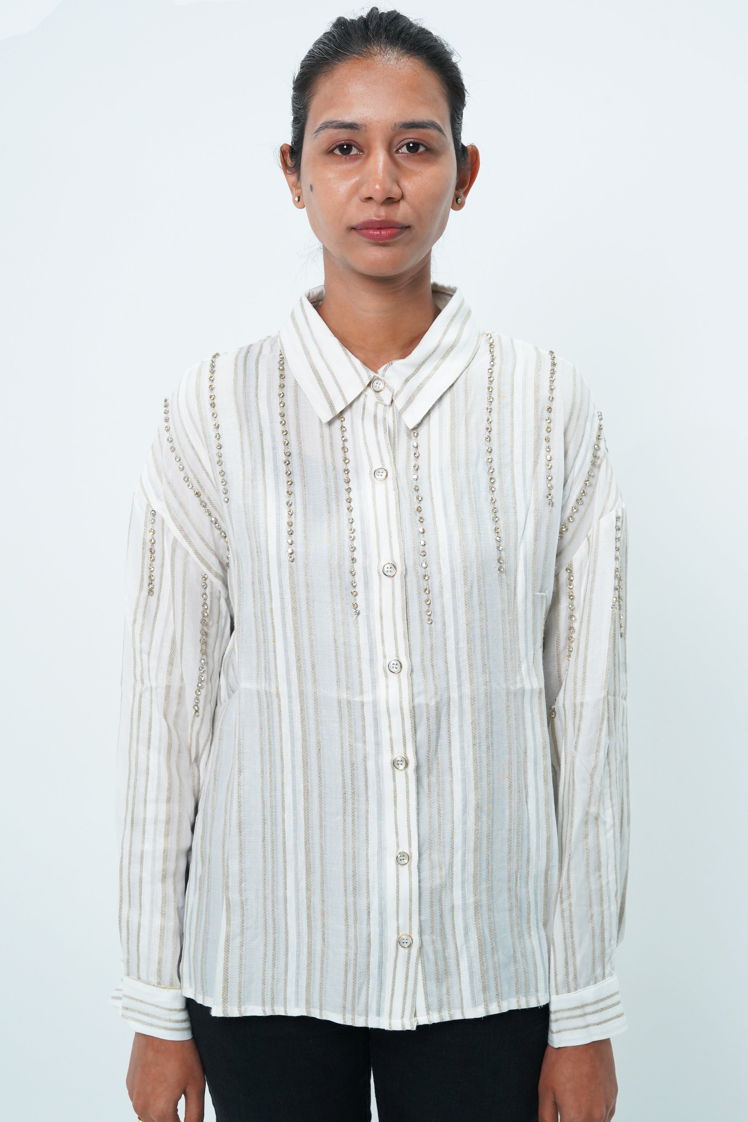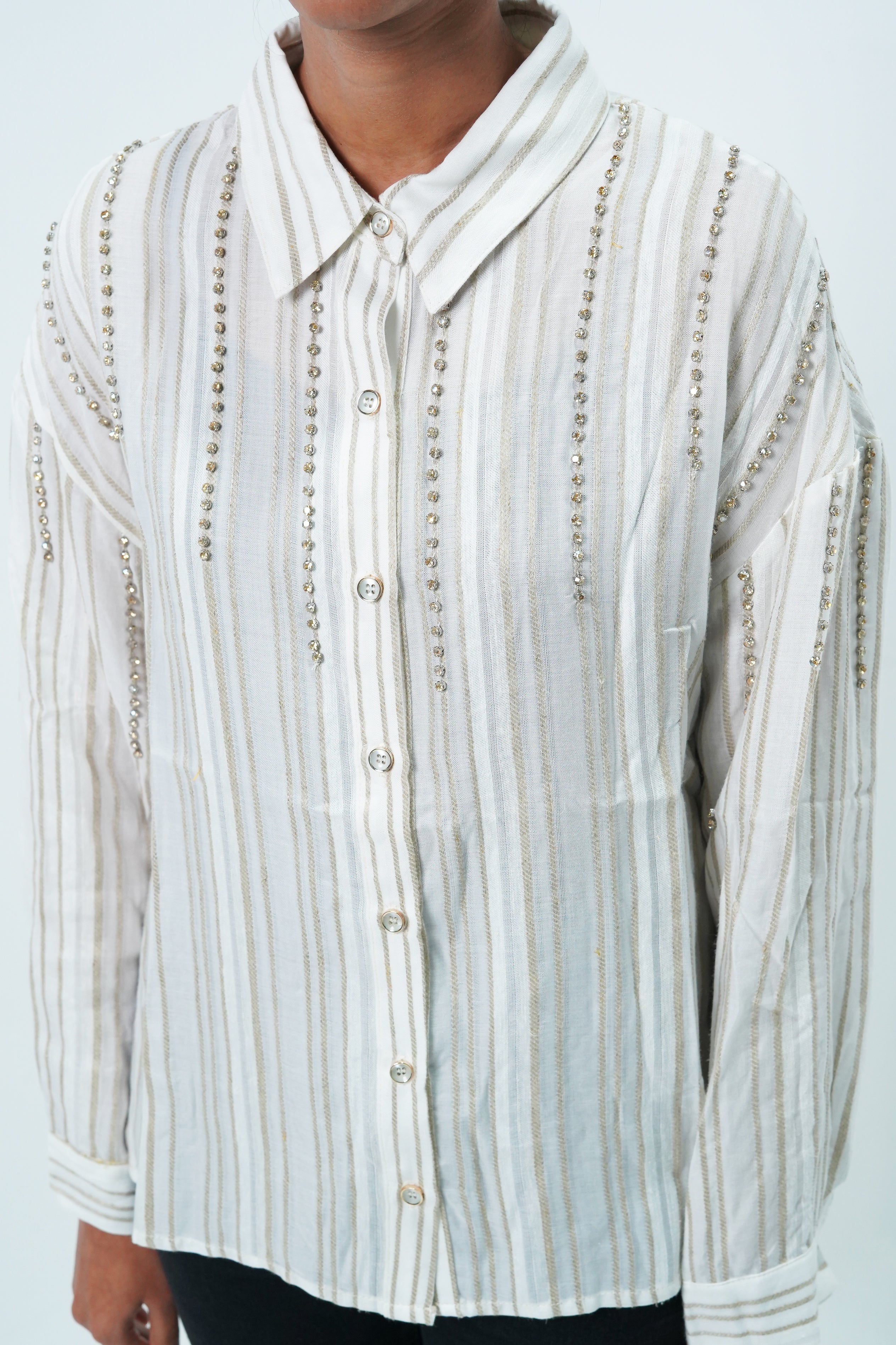 قميص أنيق متعدد الاستخدامات يجمع بين التصميم العصري واللمسات اللامعة الناعمة. يتميز بخطوط طولية مزينة بتفاصيل متألقة،...