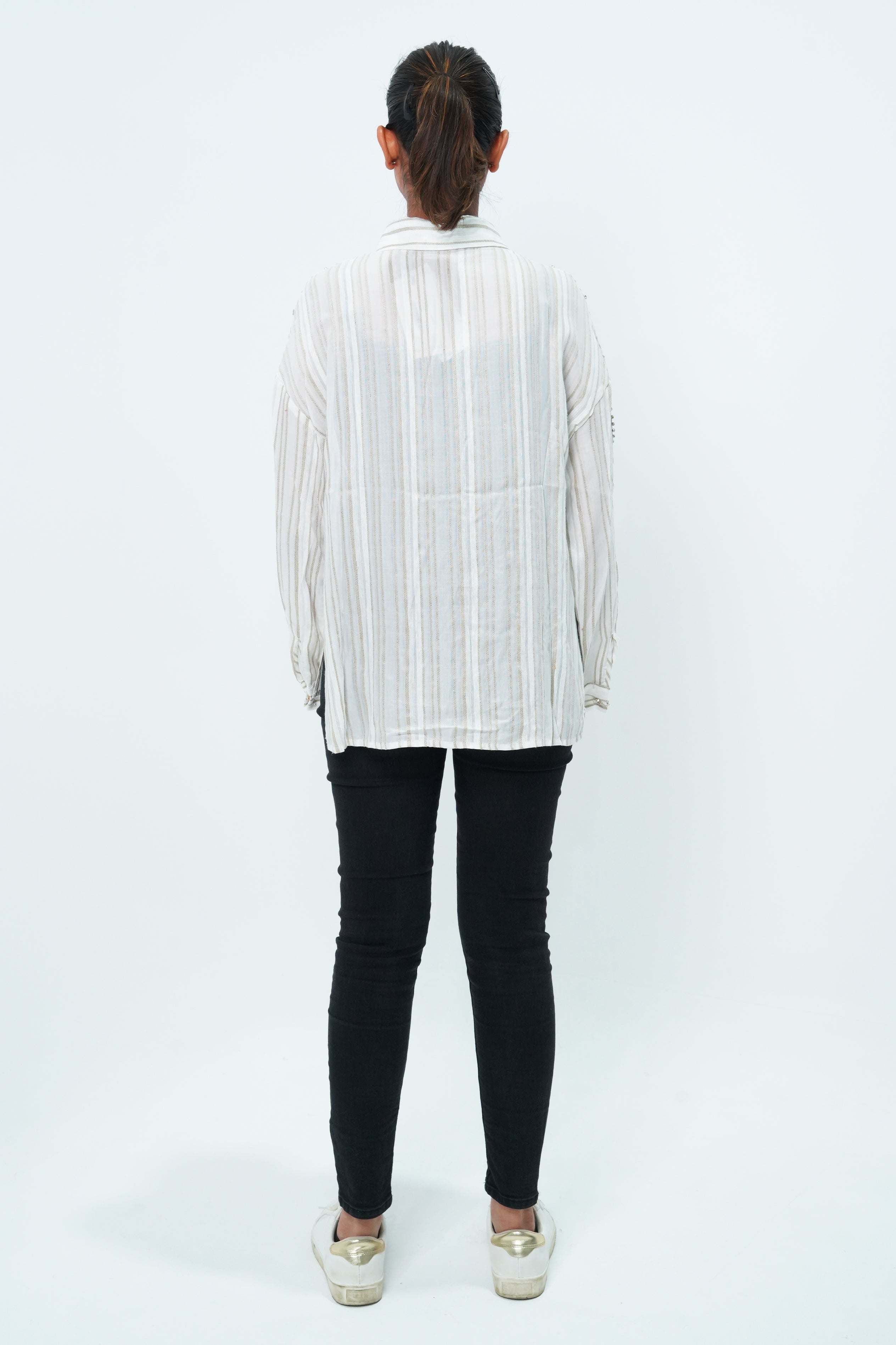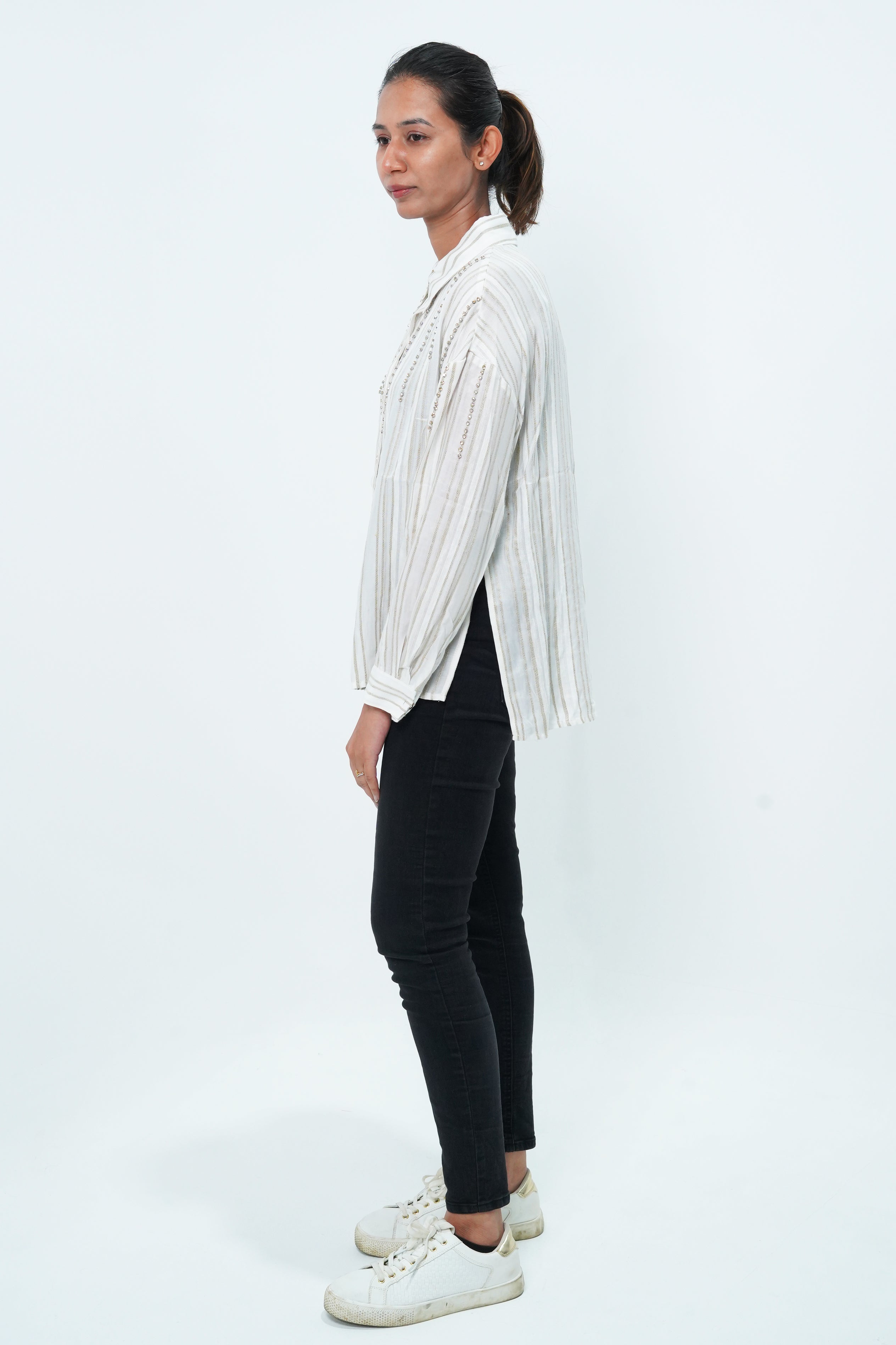 قميص أنيق متعدد الاستخدامات يجمع بين التصميم العصري واللمسات اللامعة الناعمة. يتميز بخطوط طولية مزينة بتفاصيل متألقة، مع حاشية عالية منخفضة وشقوق جانبية تمنح حرية في الحركة ولمسة عصرية. بطول يقارب 62 سم، يمكن تنسيقه بسهولة مع إطلالات كاجوال أو رسمية. يضفي الياقة الكلاسيكية مع الأزرار الأمامية لمسة أنيقة مثالية للإطلالات النهارية والمسائية.