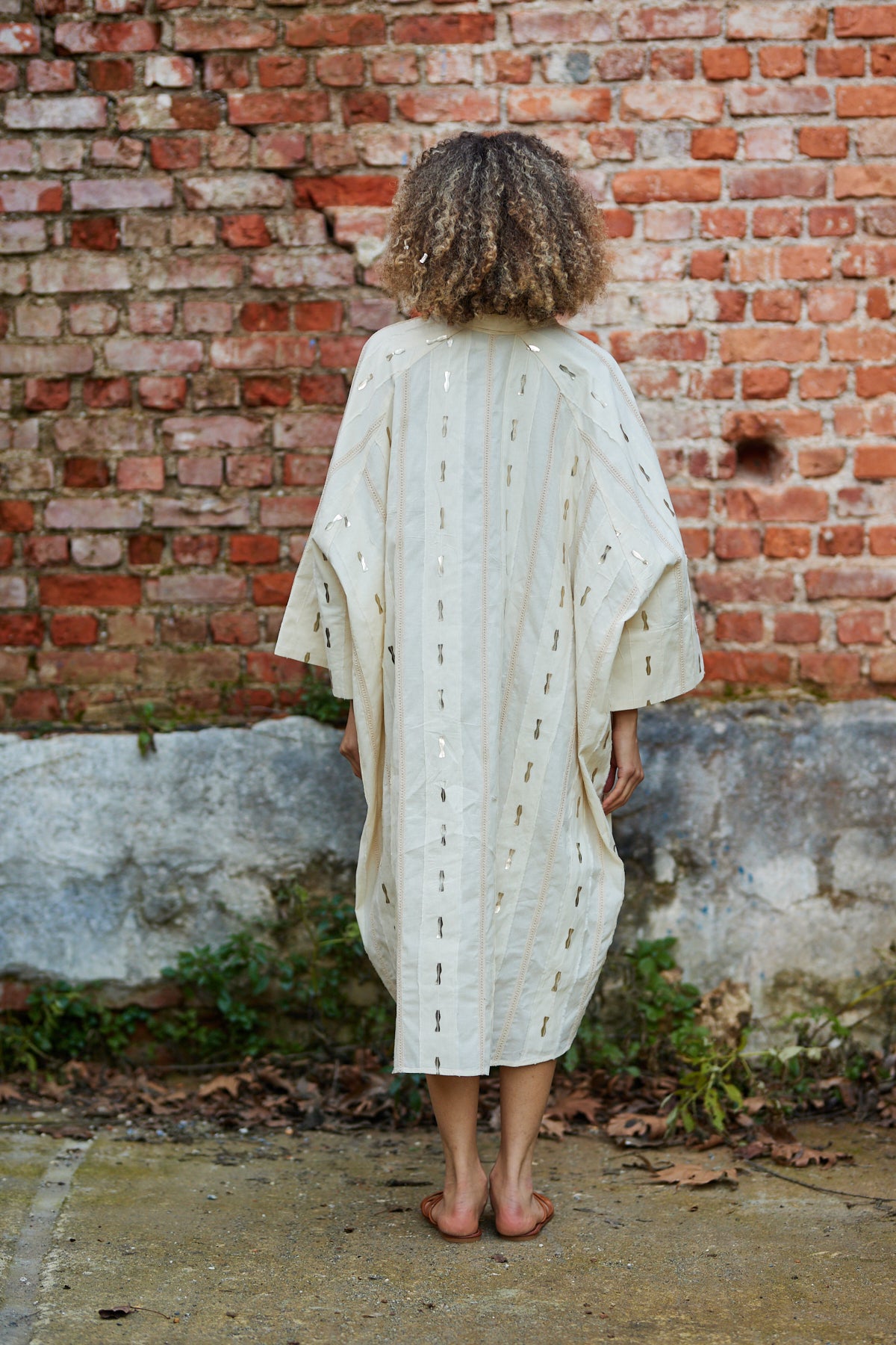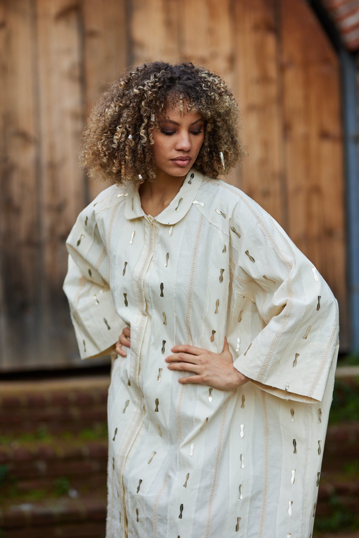 ارتدي الأناقة بكل بساطة مع هذا الفستان القميص الفاخر المطرز، المصمم لإطلالة راقية ومريحة في آنٍ واحد. يتميز بأكمام راجلان واسعة تمنحك حرية الحركة وانسيابية رائعة، بينما يضفي الياقة الكلاسيكية لمسة أنيقة ومتناسقة. تضفي التطريزات المعدنية اليدوية لمسة من التألق الناعم، مما يجعله مثاليًا للمناسبات الكاجوال والرسمية.