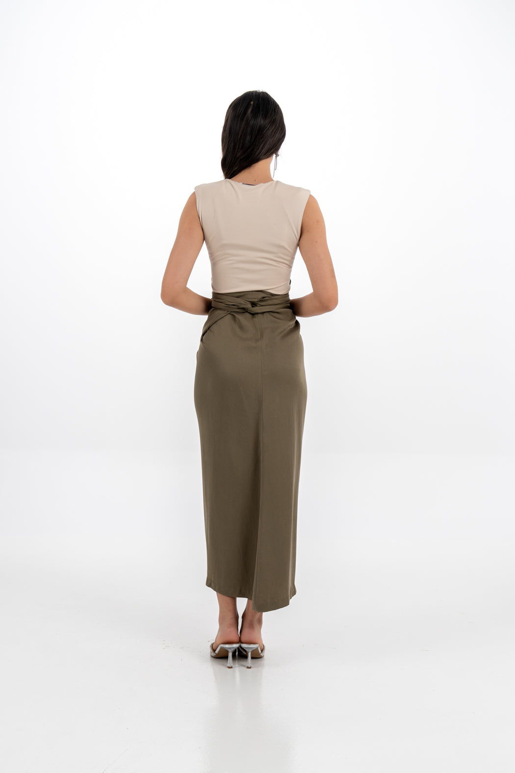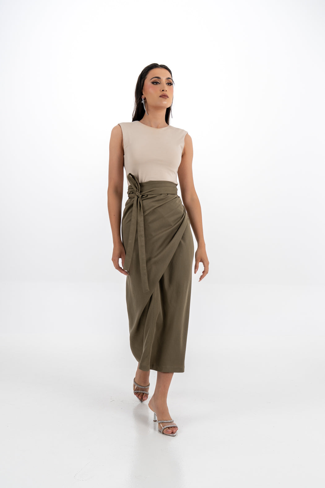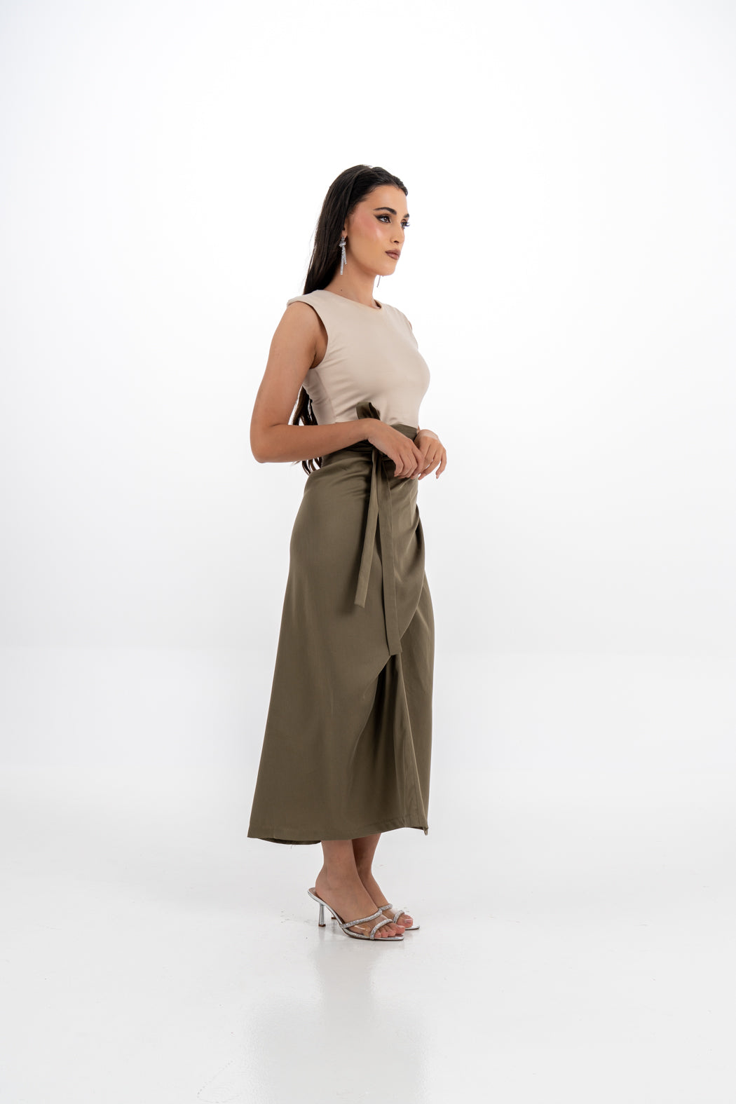 قطعة أساسية عصرية تمنحك إطلالة أنثوية راقية، تتميز هذه التنورة بتصميم غير متماثل من الأمام مع خصر عالٍ وقصة انسيابية تعزز من جمال القوام. يأتي التصميم برباط ناعم يمكن ربطه من الخلف لتوفير مقاس مريح ومخصص. يبلغ طول التنورة حوالي 100 سم، ما يمنحها مظهراً أنيقاً وطولاً جذاباً. مصنوعة من قماش خفيف ومريح، ما يجعلها مثالية للحركة والتنسيق مع البلوزة المطابقة (رقم المنتج 2507005) لإطلالة متكاملة وعصرية.