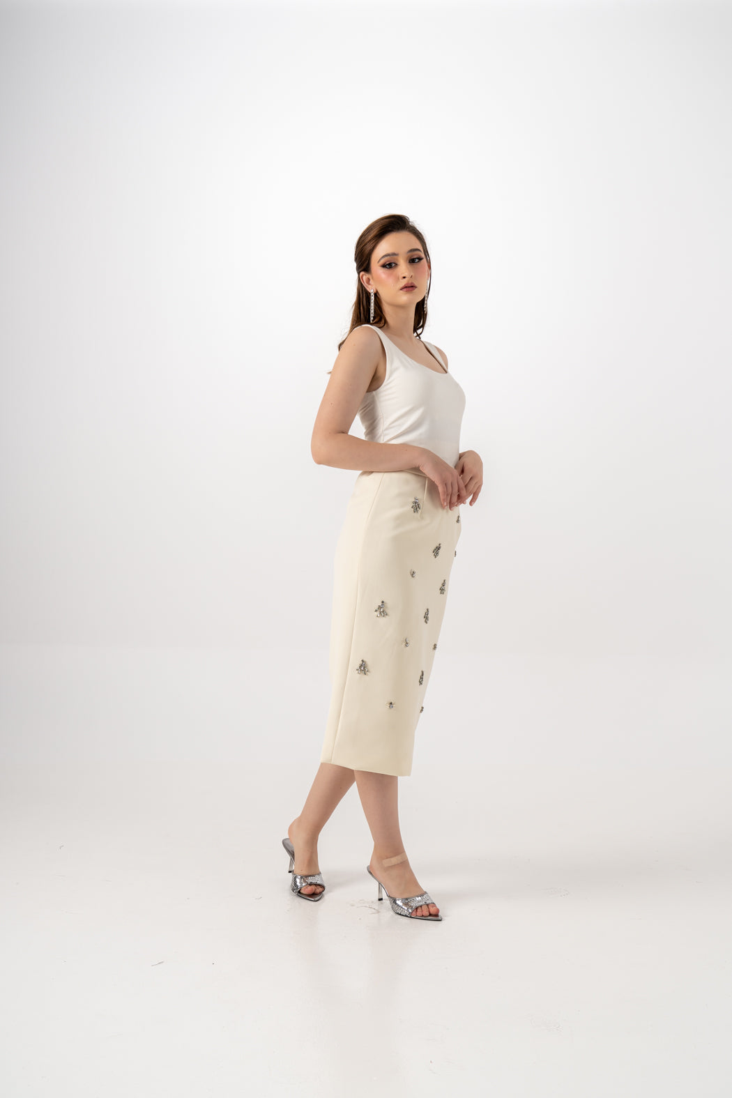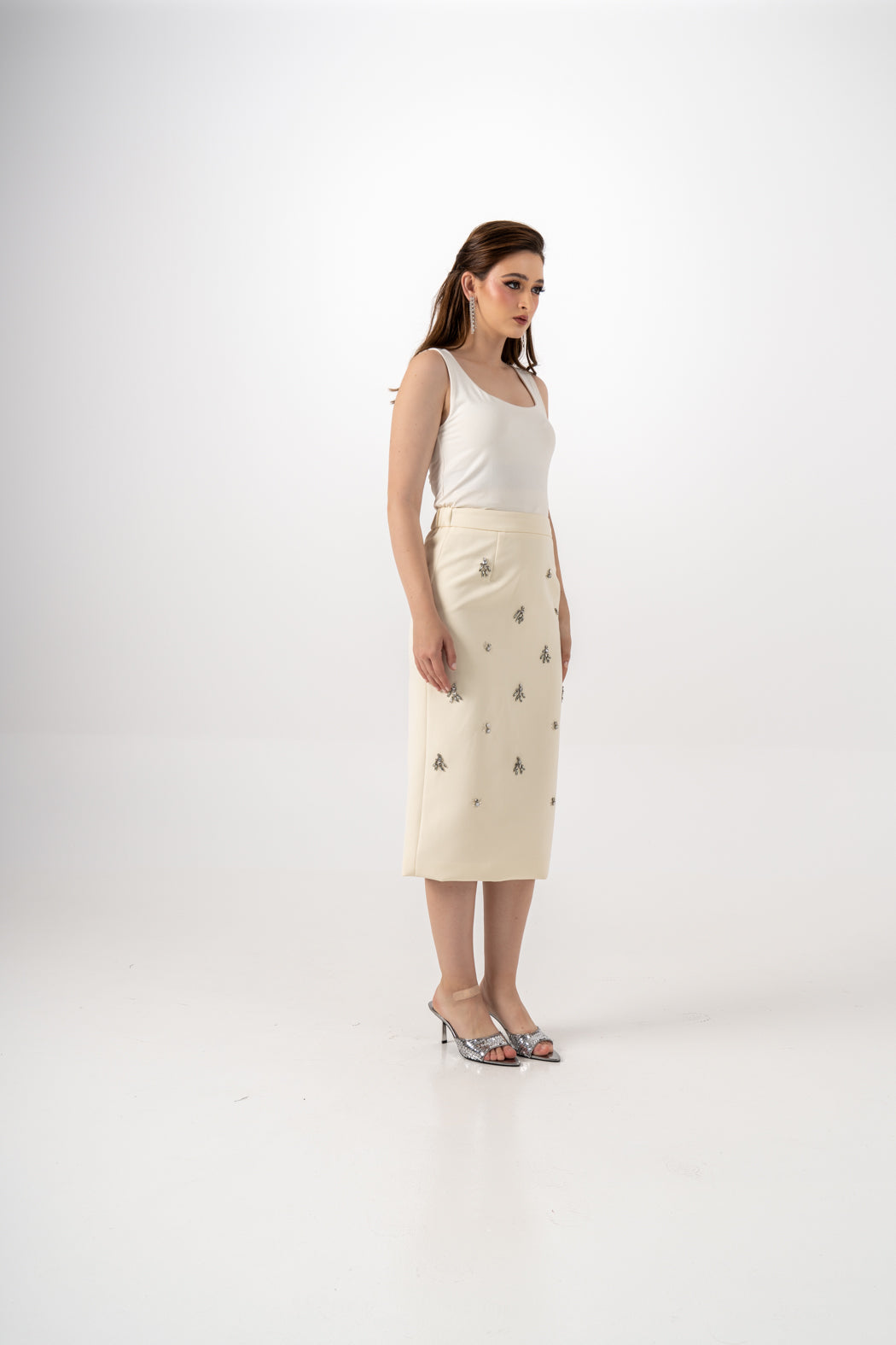 أضيفي لمسة من الرقي إلى إطلالتك مع هذه التنورة الميدي الأنيقة والمزينة بتفاصيل يدوية من الخرز وحبيبات الزينة المتلألئة. تتميز بقصّة مستقيمة وانسيابية مع خصر ناعم من الأمام ومطاطي من الخلف لراحة إضافية. الطول الميدي مع الفتحة الخلفية يمنحك حرية الحركة وأناقة لا مثيل لها، ما يجعلها مثالية للمناسبات الرسمية والسهرات الراقية.