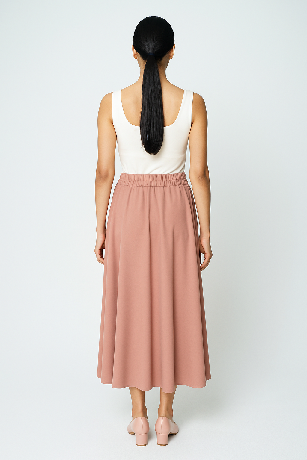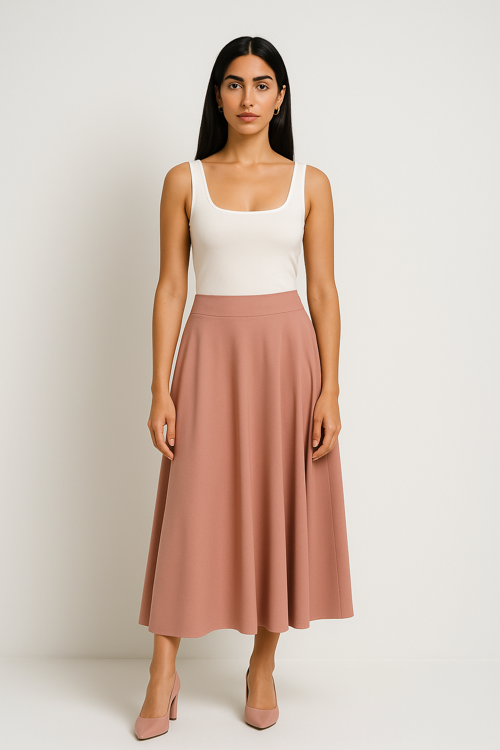 أضفي لمسة من الأناقة إلى إطلالتك مع هذه التنورة الميدي الكلاسيكية ذات القَصّة الواسعة. تأتي بتصميم مريح عند الخصر، ينساب بانسيابية إلى شكل A-line يمنحك مظهراً أنثوياً جذاباً يناسب الإطلالات اليومية والرسمية على حد سواء. يتميز الخصر المطاطي من الخلف بسهولة الارتداء مع المحافظة على مظهر أنيق من الأمام. يبلغ طولها حوالي 90 سم، ما يجعلها خياراً عملياً يمكن تنسيقه مع مختلف القطع والأحذية.