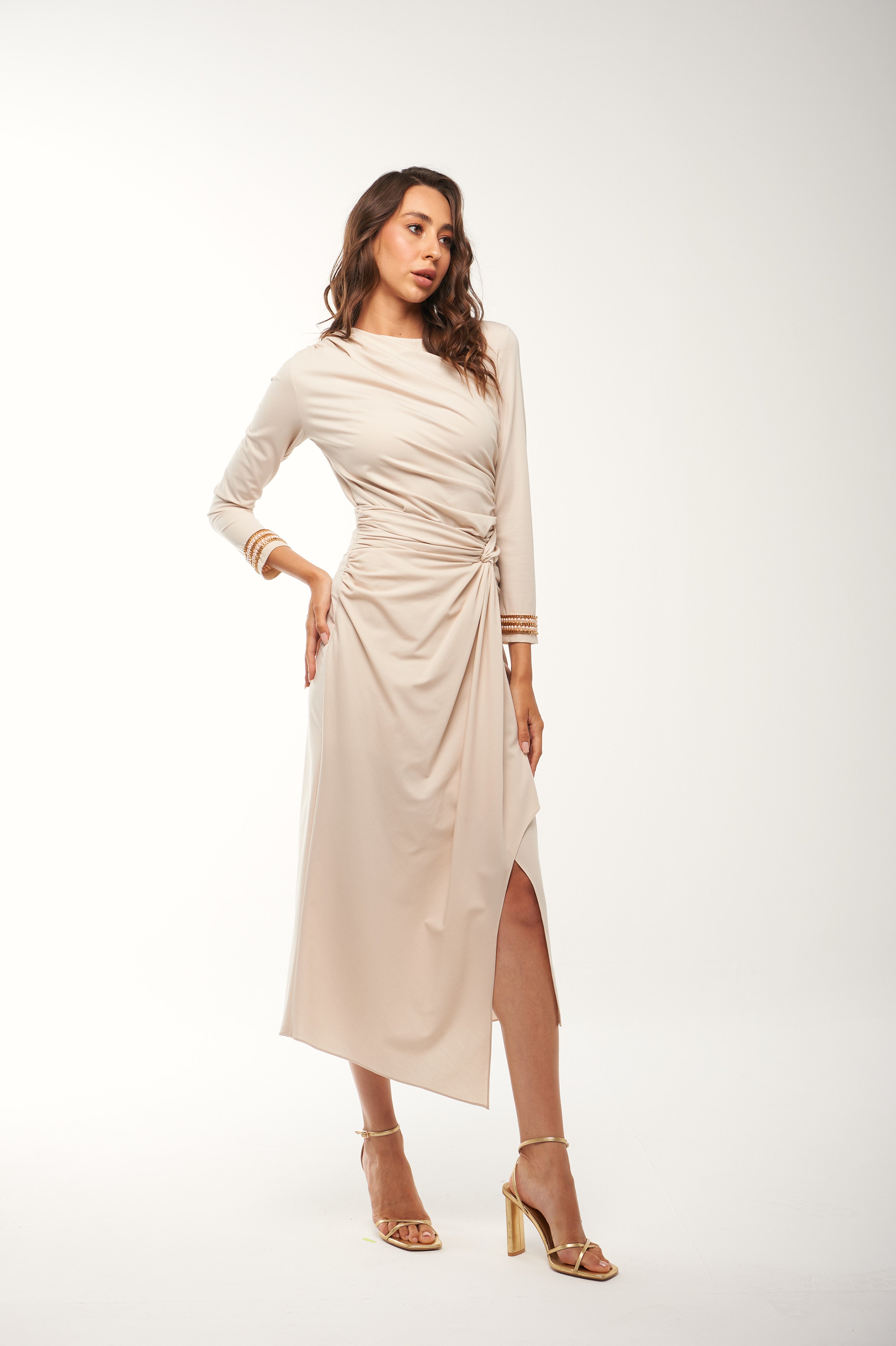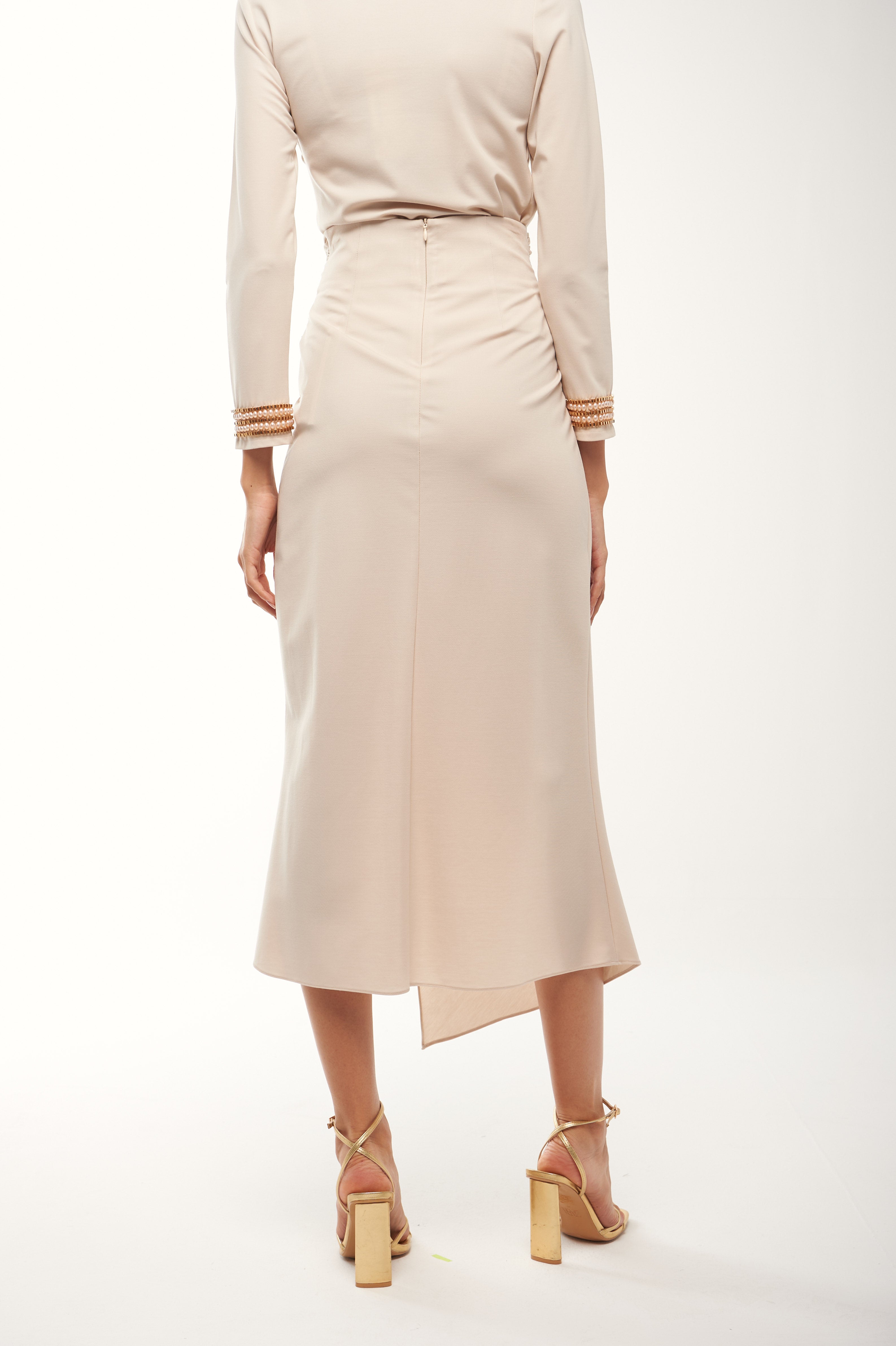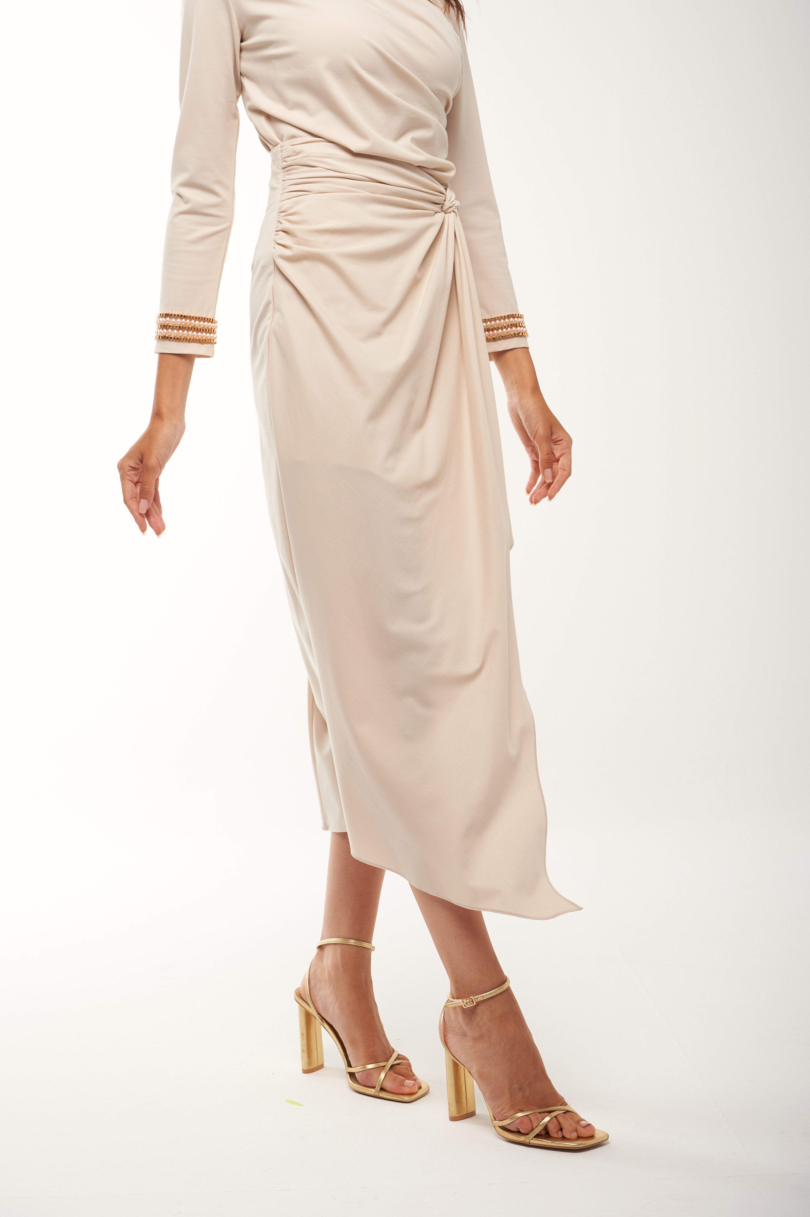 إطلالة أنثوية راقية مع هذه التنورة المتوسطة الطول المصممة بقصة درابية أنيقة وربطة عند الخصر تُبرز القوام بأسلوب ناعم وجذاب. الحافة غير المتماثلة والانسيابية تضيفان لمسة من الرقي والحركة، مما يجعلها مثالية للمناسبات الخاصة أو السهرات أو التجمعات الرمضانية.