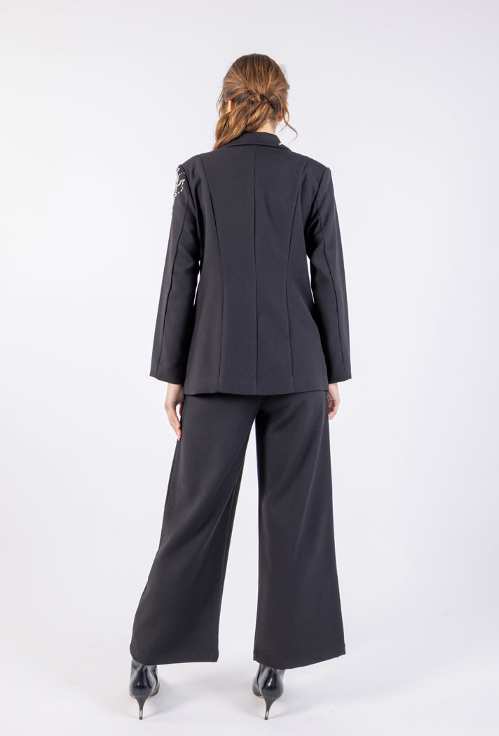 ارتقي بإطلالتك مع هذا الجاكيت الأسود المزخرف يدويًا والمزين بتطريزات كريستالية أنيقة على الأكتاف، مما يمنحه لمسة من الفخامة والرقي. يتميز بتصميم هيكلي مع ياقة كلاسيكية وطيات جيوب أنيقة، مما يجعله الخيار المثالي للمناسبات الخاصة أو الإطلالات الرسمية الأنيقة.