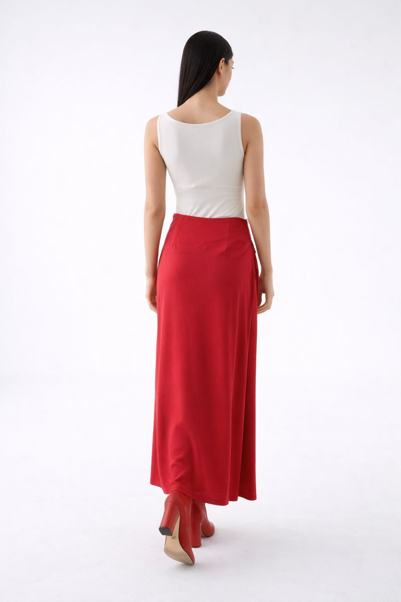 تتميز هذه التنورة الماكسي الأنيقة بتصميم غير متماثل يضفي لمسة راقية على الإطلالات الشتوية الفاخرة. تأتي بتفاصيل ثنيات ناعمة عند الخصر تمنح القوام مظهراً أنيقاً وانسيابياً مع حركة رقيقة.