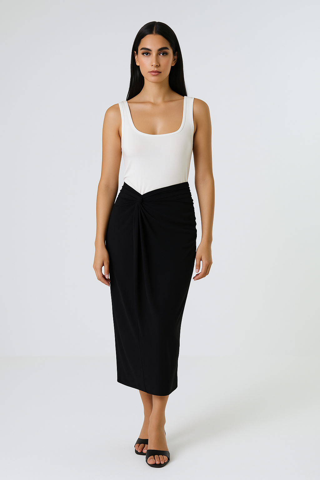 ارتقي بإطلالتك اليومية مع هذه التنورة الميدي ذات التصميم غير المتماثل. تتميز بتفصيلة عقدة أنيقة تتجمع بشكل انسيابي عند الخصر لتمنحك قواماً ممشوقاً وإطلالة راقية بلمسة بسيطة. ينساب القماش بسلاسة لمنحك مظهراً أنيقاً وراحة مثالية تناسب الإطلالات الصباحية والمسائية.