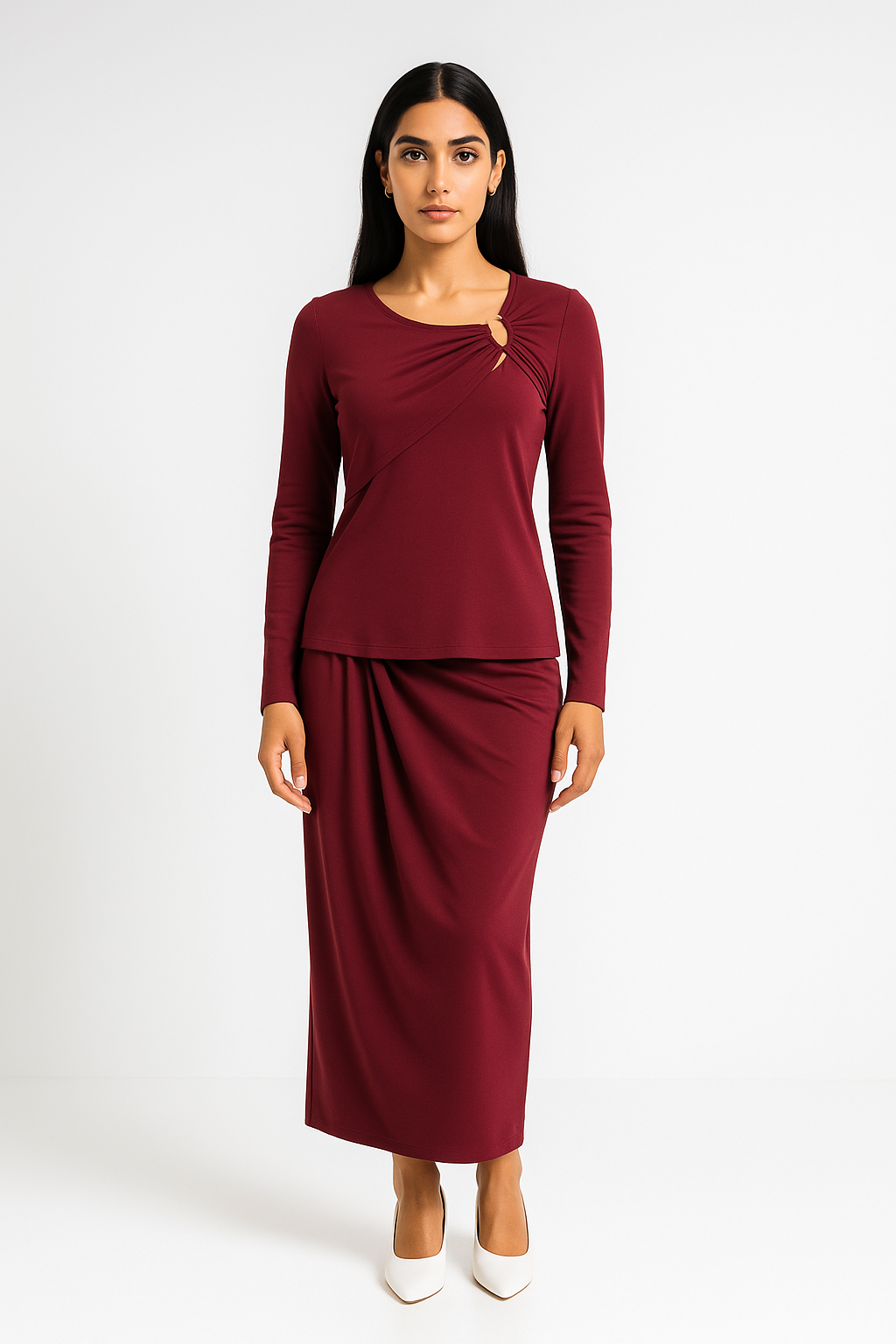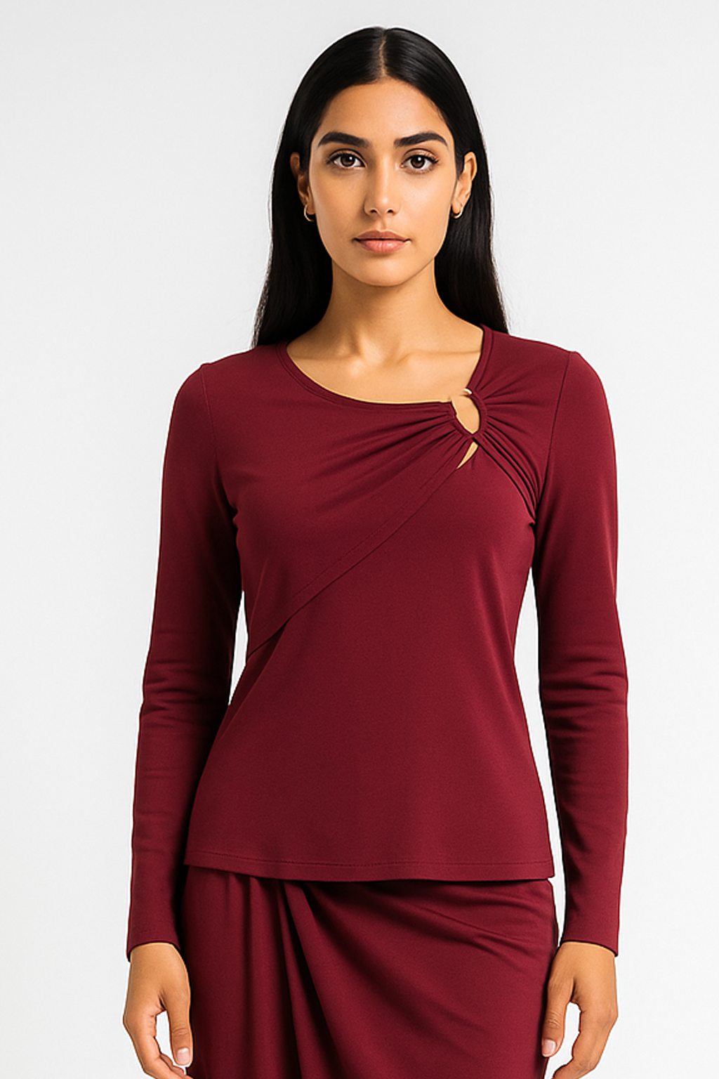 لمسة عصرية على الأناقة الكلاسيكية. يأتي هذا التوب بأكمام طويلة مع طبقة ملتفة بتصميم غير متماثل تتجمع عند فتحة الرقبة بحلقة معدنية أنيقة، مما يخلق شكلاً ناعماً ومُشكّلاً يبرز جمال الجزء العلوي من القوام. القماش المطاطي الناعم ينساب على الجسم براحة تامة مع مظهر مصقول يناسب الإطلالات اليومية الراقية والمناسبات المسائية الأنيقة.