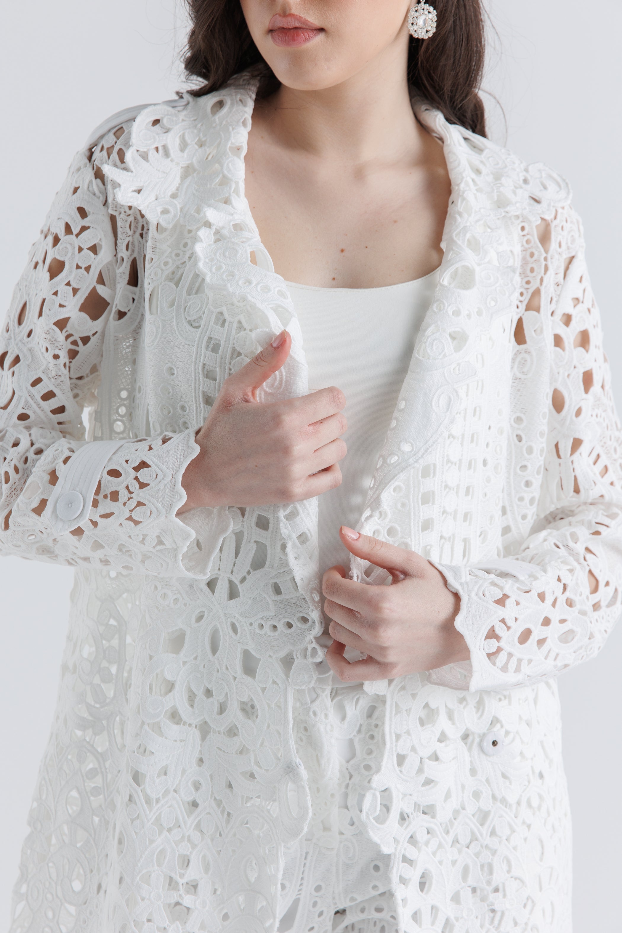 أضيفي لمسة من الأناقة والرقي إلى إطلالتك مع هذا الجاكيت الطويل المصنوع من قماش الليزر كَت المميز. يتميز بتصميم أنثوي بقَصة محددة عند الخصر وتفاصيل قصات مفتوحة متقنة تغطي القماش بالكامل. الياقة الواسعة والحواف المزخرفة تضيفان لمسة فاخرة، بينما الحزام المصنوع من نفس القماش يبرز الخصر لإطلالة أنيقة. مثالي للتنسيق فوق الإطلالات الرسمية أو الكاجوال.