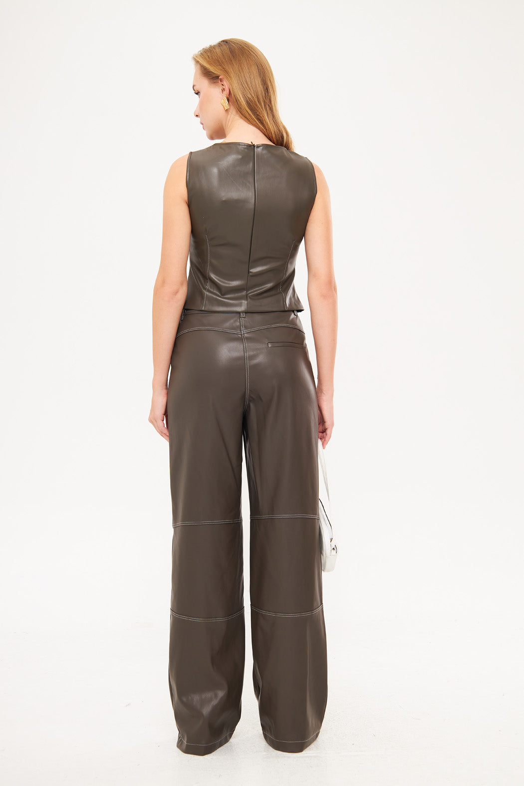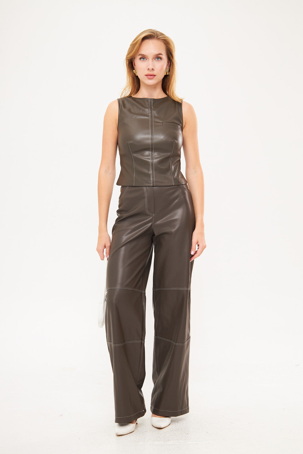 أضف لمسة جريئة إلى خزانة ملابسك مع هذا القميص المصنوع من الجلد الصناعي بدون أكمام. تم تصميم هذا القميص بقصّة أنيقة وضيّقة، ويتميز بخياطة تفصيلية تعزز مظهره العصري. مثالي للارتداء مع الجينز أو التنانير ذات الخصر العالي، فهو اختيار أنيق لإطلالة أنيقة دون عناء.
