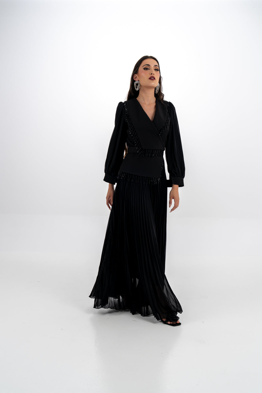 تألقي بإطلالة راقية لا تُضاهى مع هذا الفستان الماكسي المصمم بعناية ليمزج بين الفخامة والأنوثة. يتميز بقصة علوية على شكل لفّة مع ياقة عريضة تضفي لمسة كلاسيكية راقية، ومزدان بتطريز فاخر من الخرز والترتر المتدلّي برقة على الكتفين والخصر. تنساب تنورته الطويلة والمكسّرة بأناقة لتمنحك حرية في الحركة وجاذبية لا تقاوم، في حين يُبرز الخصر بحزام عصري مزوّد بحقيبة قابلة للإزالة تضيف لمسة عملية وعصرية.