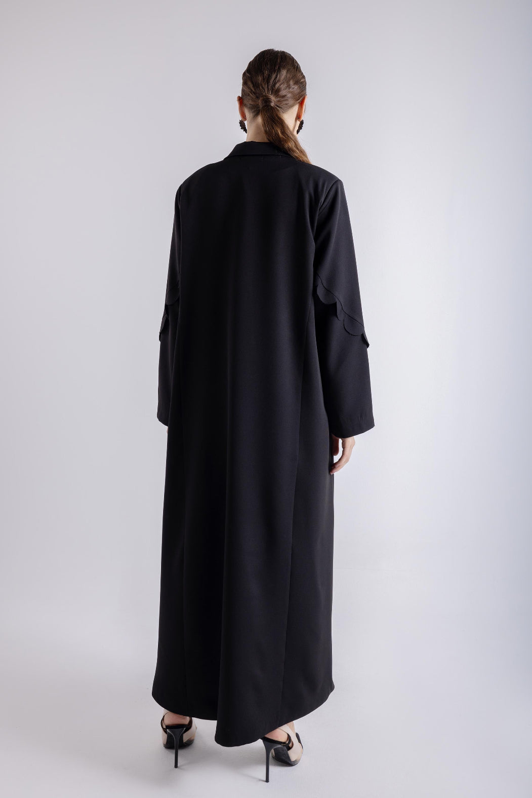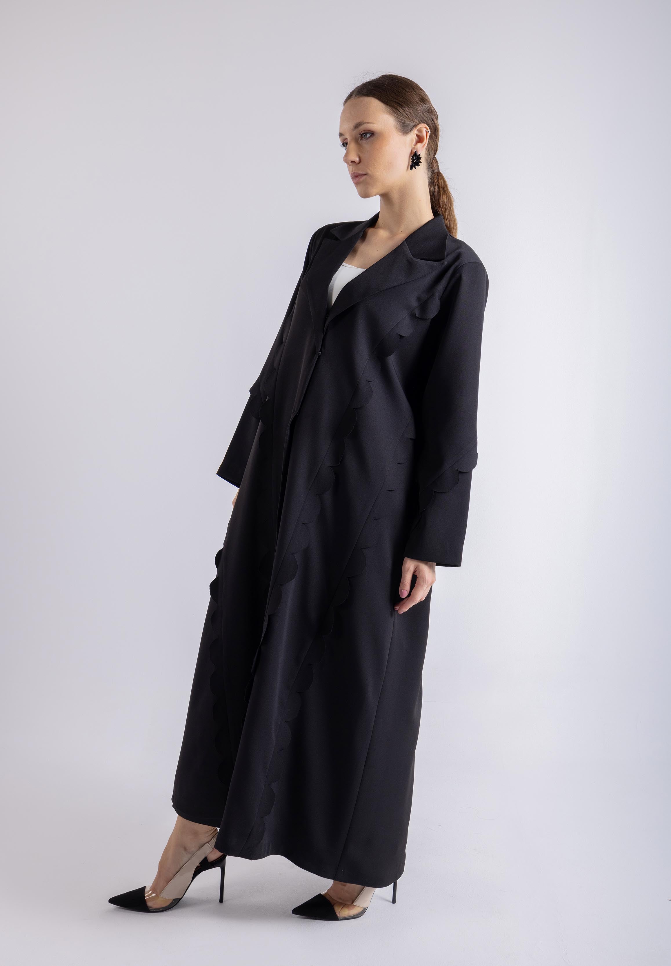 Introducing the Chic Elegance Abaya, a masterpiece of design and sophistication. This solid-colored abaya captivates with its unique half-circle cuts that create an intriguing visual texture and enhance its overall flow. The elegant silhouette combined with these artistic cuts offers a modern twist on classic attire.