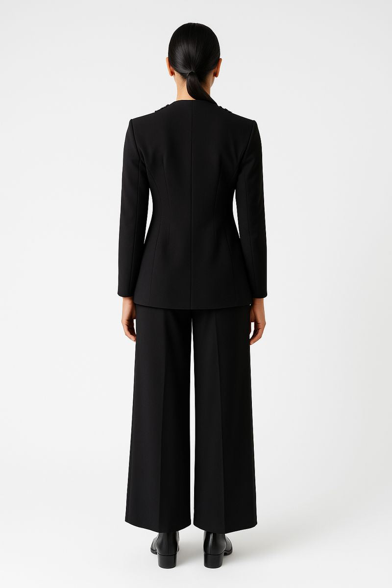 Designed for elevated festive dressing, the Amara Embellished Tailored Wrap Jacket blends modern tailoring with refined elegance, making it an ideal choice for Ramadan gatherings and Eid celebrations. Featuring a sleek wrap-style front with a concealed snap button closure, this jacket is beautifully enhanced with hand-applied bead and embellishment detailing along the collar, adding a subtle statement of luxury. The clean structure and smooth lines create a polished silhouette that transitions effortlessly from day to evening.