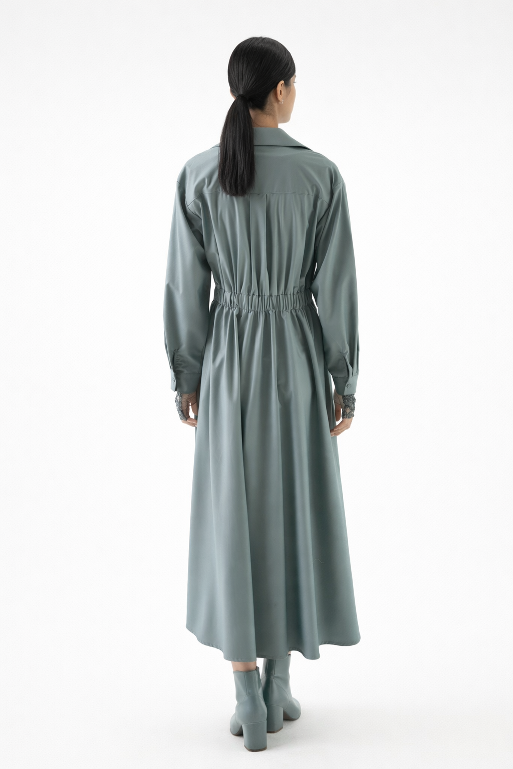 This elegant maxi blazer dress is designed with a refined, elongated silhouette that balances tailored structure with graceful movement. Featuring a sharp lapel neckline and a wrap-style front, the design is elevated with a double-button closure that adds a polished, sophisticated finish. The back waist is softly gathered to enhance the shape while ensuring comfort and fluidity. Long sleeves extend into delicate lace gloves, creating a regal, princess-inspired touch that contrasts beautifully with the clean lines of the dress. With an approximate length of 138 cm, this piece embodies timeless elegance and modern femininity.