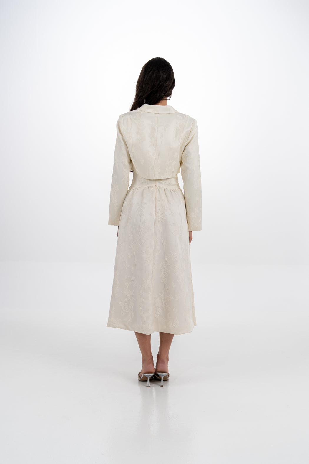 Refined and elegant, this cropped jacket is crafted from premium brocade fabric featuring an intricate tone-on-tone floral pattern. Designed with a structured silhouette and classic lapel collar, it adds a sophisticated layer to both formal and semi-formal ensembles.