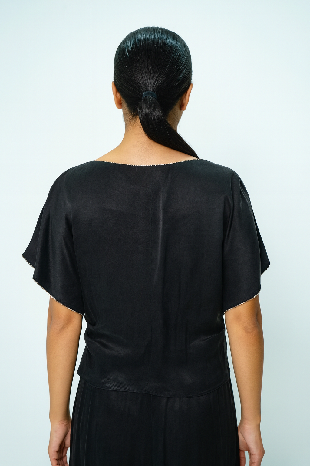 A refined and feminine top featuring a graceful scoop neckline and short sleeves, both adorned with a delicate embellished lace line. Designed with gentle gathers at the waist to create a flattering, softly cinched silhouette, this 54 cm top blends elegance with comfort. Crafted from lightweight, fluid fabric and finished with a side zip closure for a seamless fit, it pairs beautifully with Skirt 2501035 for a coordinated, polished look.