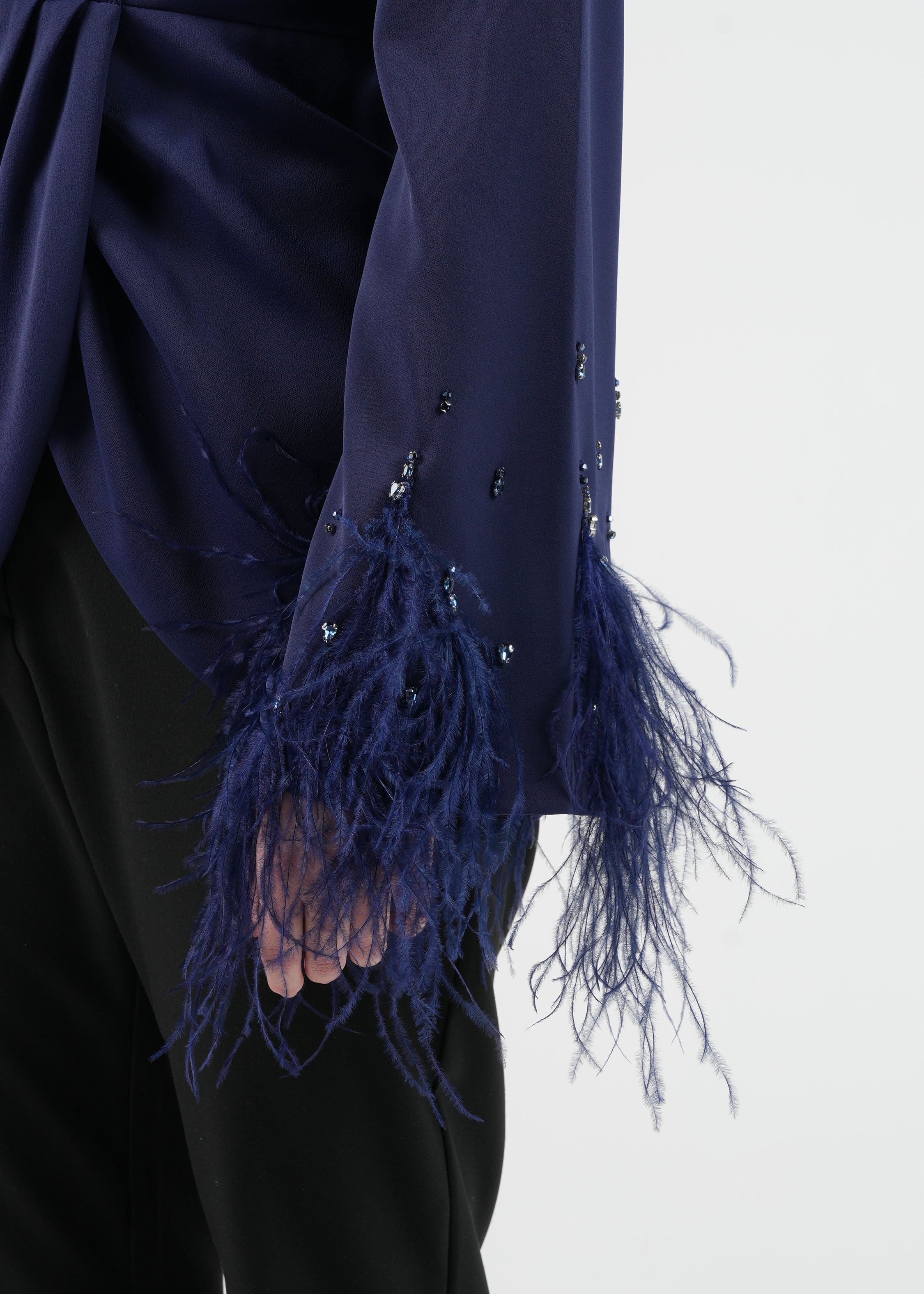 Elevate your style with this Embellished Feather Cuff Blouse, featuring a sweetheart neckline, intricate embellishments, and dramatic...