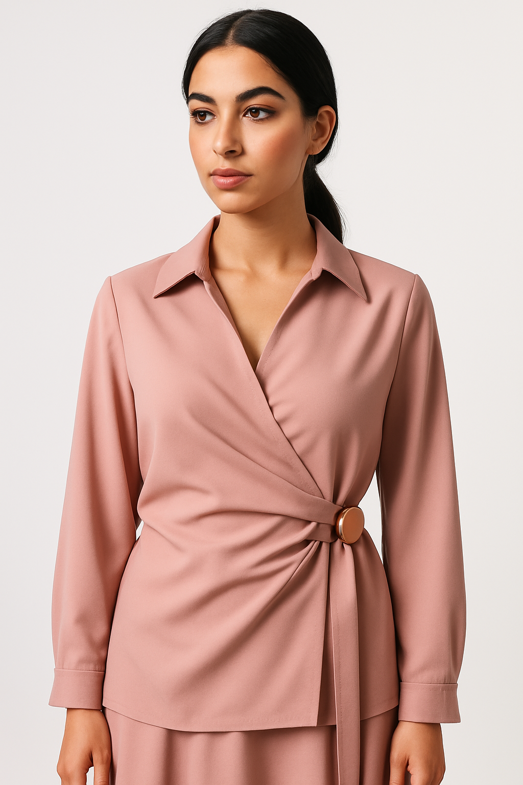 This elegant wrap-style blouse combines modern sophistication with timeless appeal. Featuring a collared neckline, long sleeves, and a wrap front secured with a chic buckle, it creates a flattering silhouette. With an approximate length of 75 cm, it offers versatile styling that works for both formal and casual occasions.