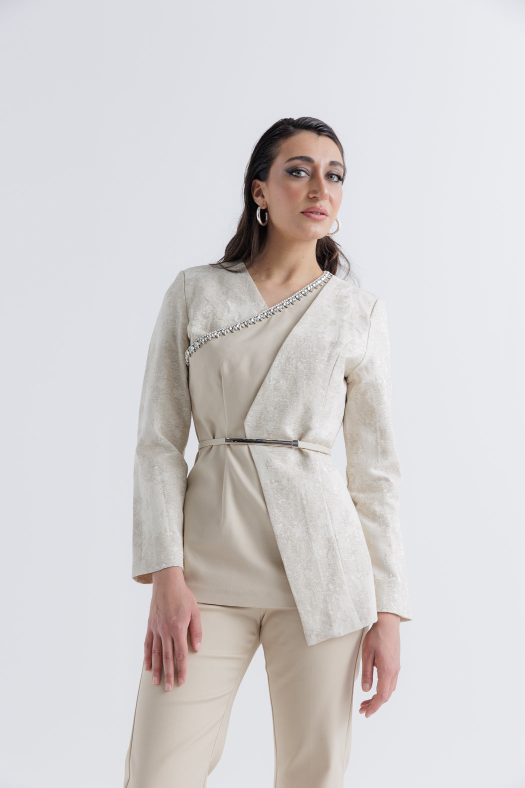 Make a statement with this embellished asymmetrical jacquard jacket, crafted for Ramadan and Eid celebrations. Featuring a structured silhouette with an elegant contrast panel, this design exudes modern sophistication. The asymmetrical neckline, adorned with sparkling embellishments, adds a touch of glamour, while the tailored fit enhances your figure. Finished with a sleek waist belt, this jacket offers both style and structure, making it a refined choice for special occasions.