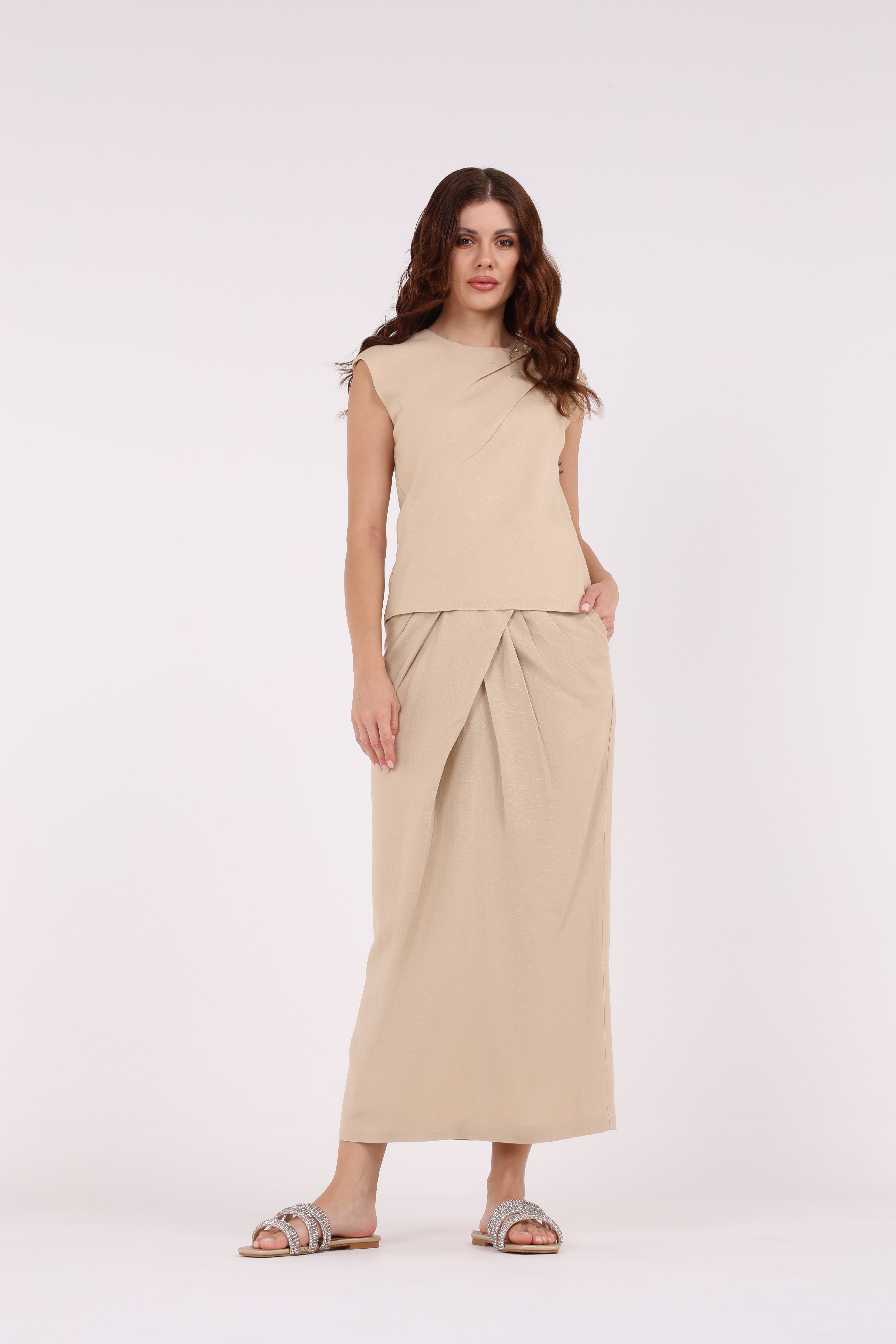This stylish solid top features elegant pleating that adds texture and sophistication to its design. The standout embellishments on the shoulders provide a touch of glamour, making it perfect for both casual and dressy occasions. Crafted from high-quality fabric, the top offers comfort while accentuating the figure with its flattering fit. The pleated detailing enhances the overall silhouette, creating a refined look that pairs beautifully with skirts,