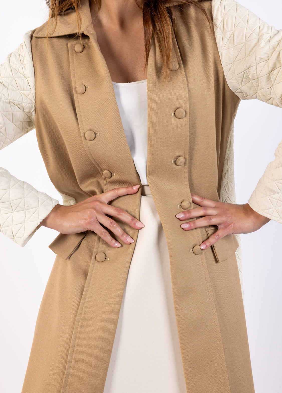 Enhance your style with this elegant two-tone long coat, featuring a sophisticated blend of colors and quilted detailing on the sleeves. Designed for the modern woman, this coat combines fashion and function to keep you warm and stylish during the colder seasons.