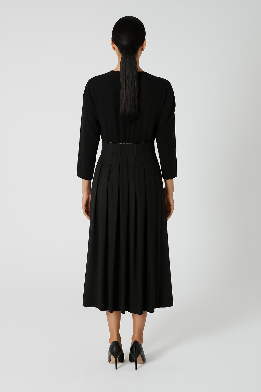 For ease and comfort, the dress includes a concealed under-arm zipper, ensuring smooth wear while maintaining a seamless and polished finish.