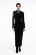 Soft draping and gentle gathers at the waist further enhance the silhouette, offering a graceful flow through the length of the dress. Designed with long sleeves and a sleek profile, this dress is ideal for winter evenings and formal occasions.