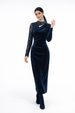 Soft draping and gentle gathers at the waist further enhance the silhouette, offering a graceful flow through the length of the dress. Designed with long sleeves and a sleek profile, this dress is ideal for winter evenings and formal occasions.