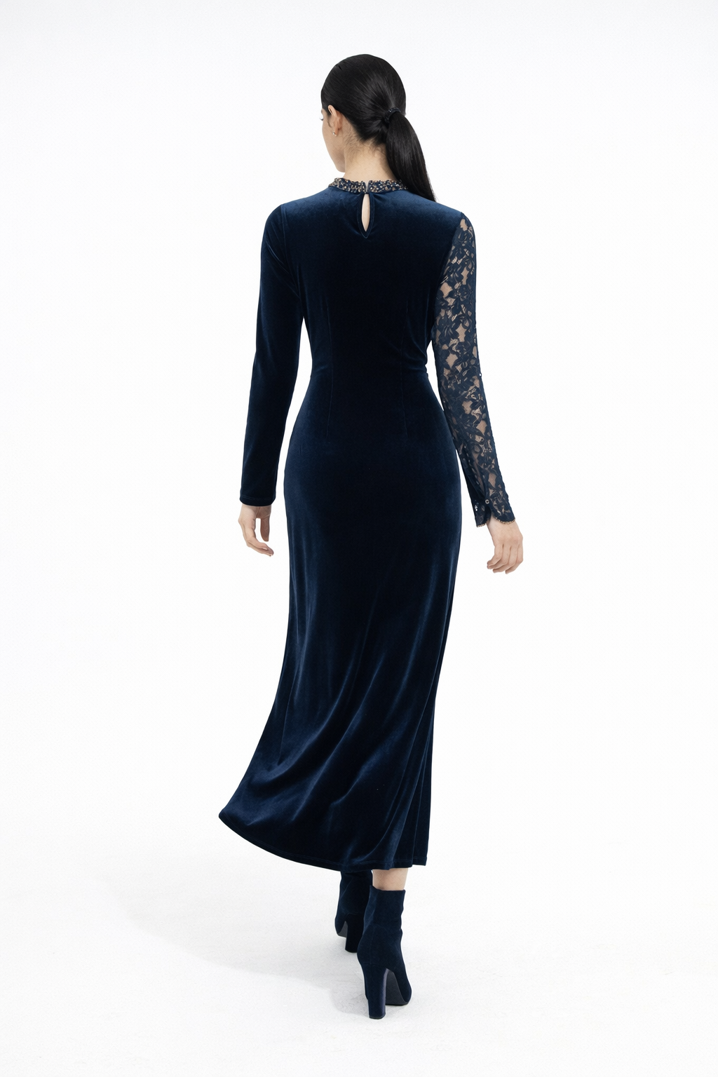 The design is elevated with an asymmetrical neckline accented with delicate embellishments, adding a subtle statement of elegance. One sleeve is crafted from intricate lace, while the other is made from velvet, creating a striking contrast that enhances the uniqueness of the piece. The lace sleeve is finished with an embellished trim detail, adding refined sparkle and craftsmanship.