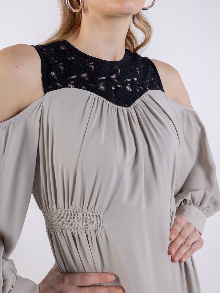 Elegant Cold-Shoulder Midi Dress with Lace Detailing