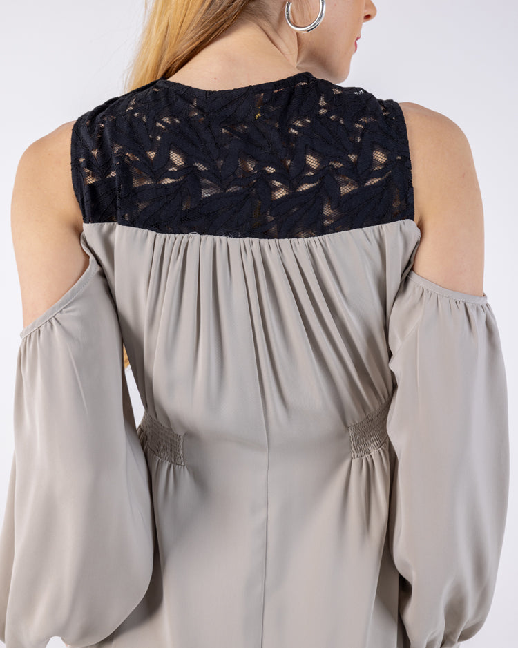 • Cold-shoulder cut with a lace panel neckline for a refined yet trendy look.