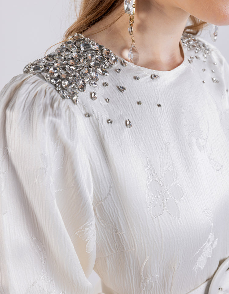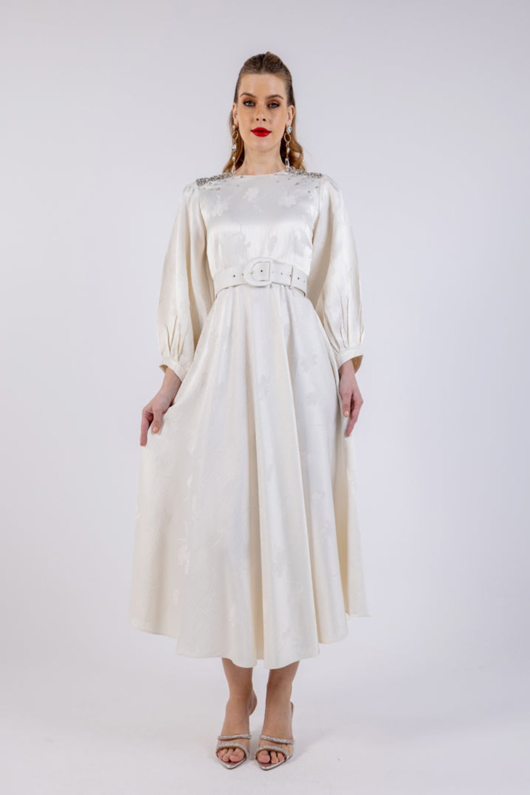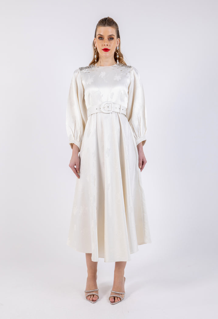 Step into sophistication with our Floral Jacquard A-Line Dress. Crafted from a textured fabric with delicate floral patterns, this dress exudes refined charm. The puffed sleeves and cinched waist belt add structure, making it a perfect choice for formal gatherings or dinner parties.