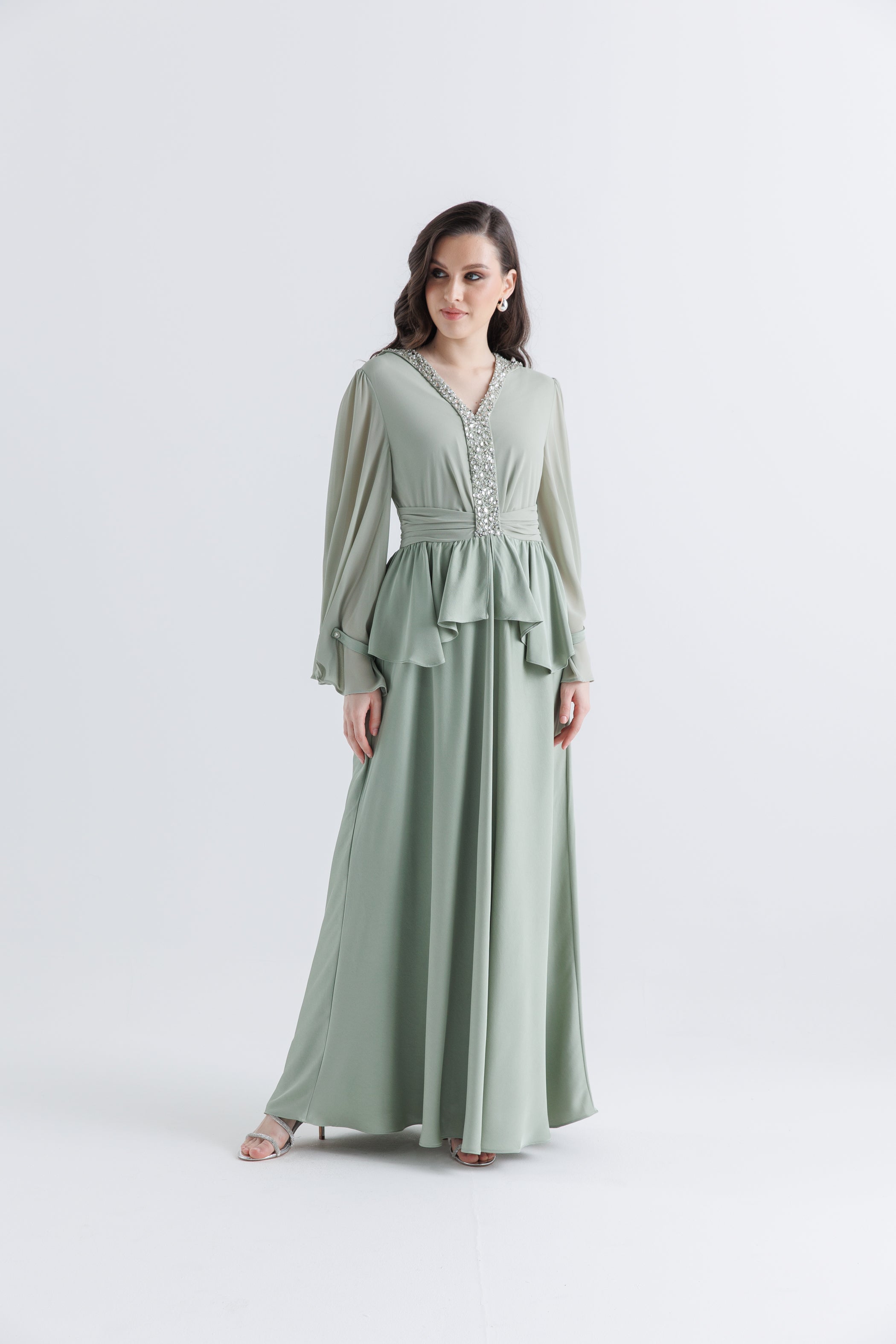 This graceful peplum gown blends modest sophistication with glamorous details. Designed with a flattering V-neckline, the bodice is accented by a shimmering panel of crystal embellishments that elevate the overall look. The soft chiffon sleeves flow elegantly with subtle pleating, while the layered peplum waist adds a romantic, structured silhouette. The skirt falls beautifully in an A-line cut, offering both comfort and elegance for formal occasions, evening gatherings, or weddings.