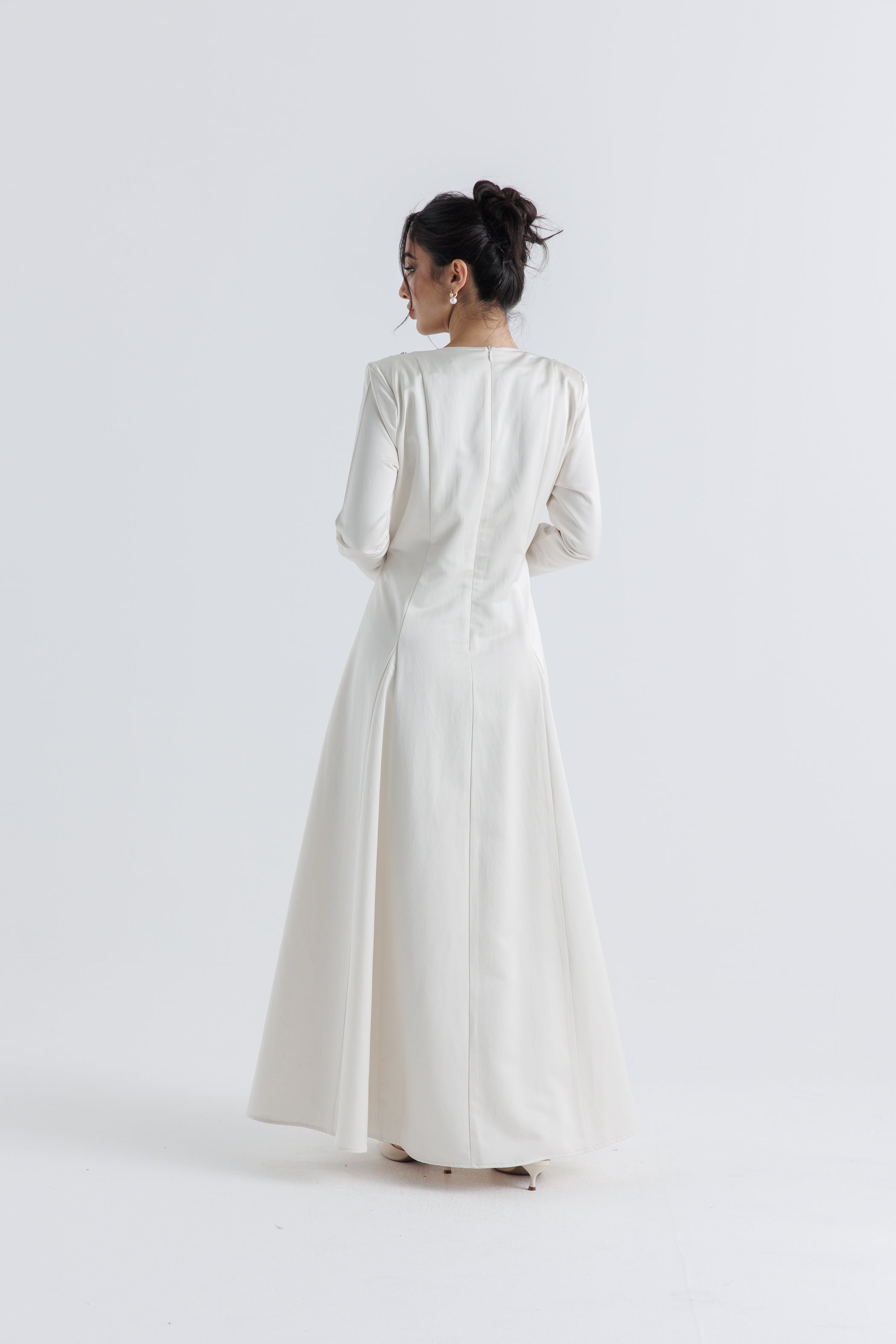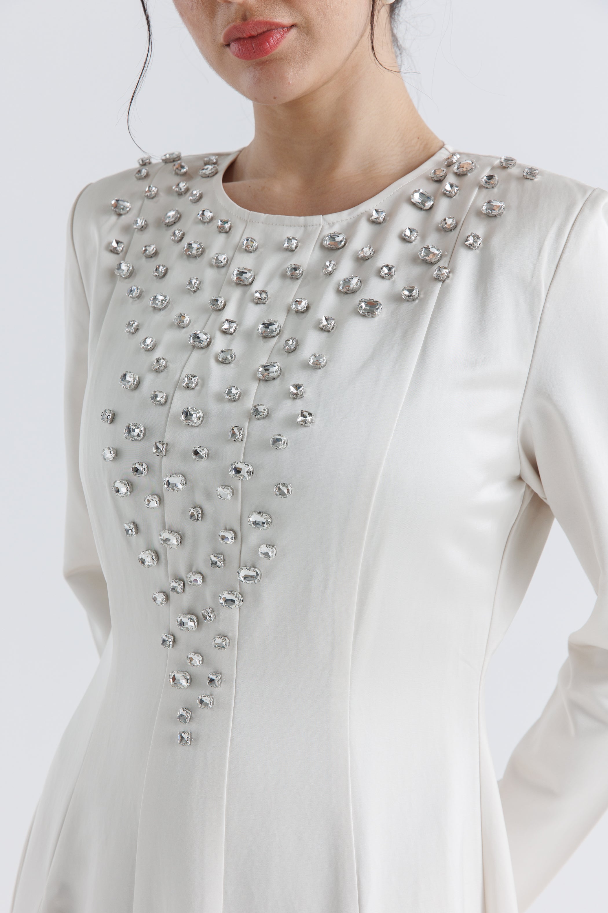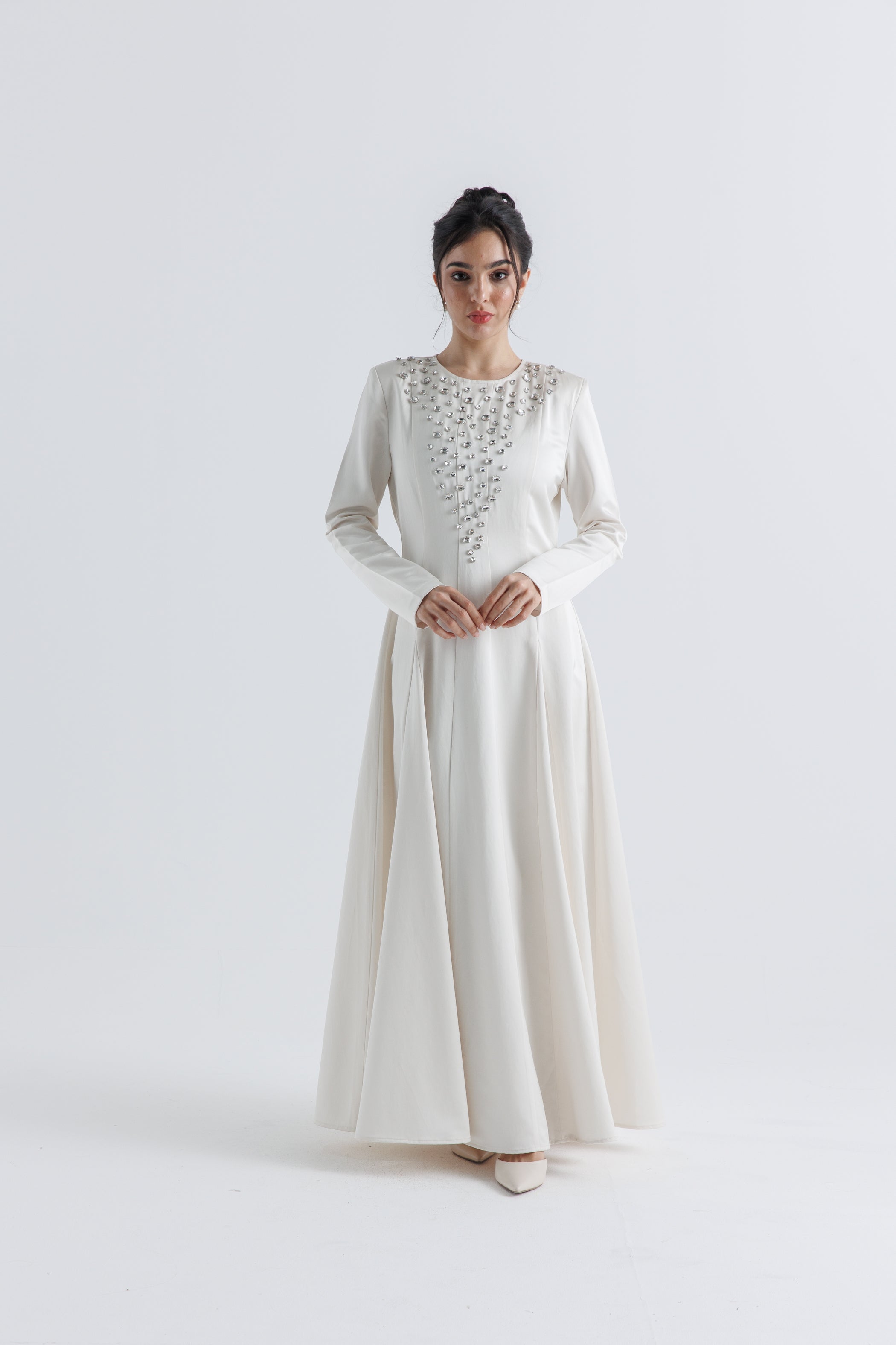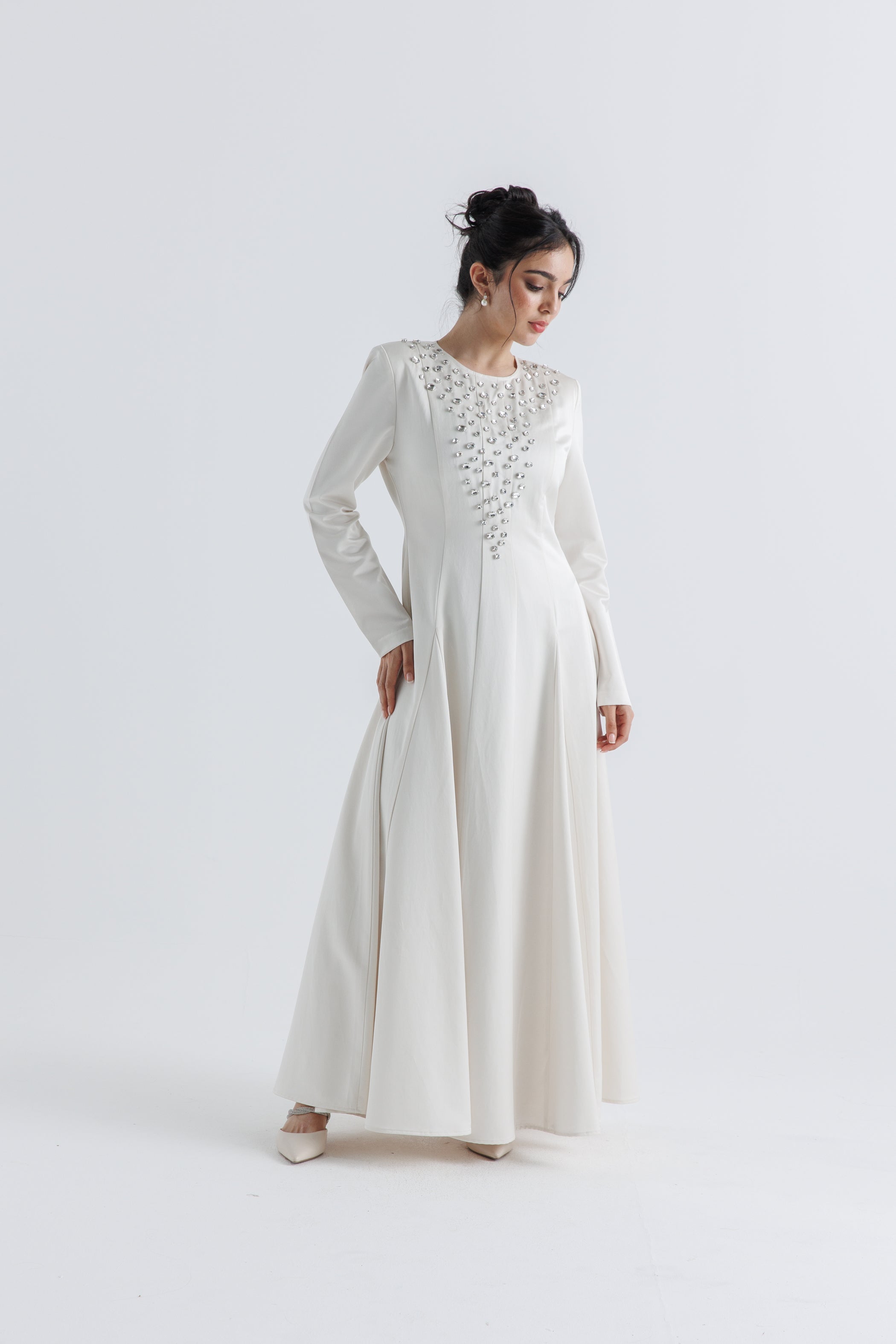 Step into refined elegance with this full-length A-line gown, adorned with radiant crystal embellishments across the chest. Designed with a modest round neckline and long sleeves, the dress combines classic structure with contemporary sparkle. The clean panel lines enhance the graceful silhouette, while the satin-finish fabric adds a luxurious sheen, perfect for formal gatherings or evening occasions.