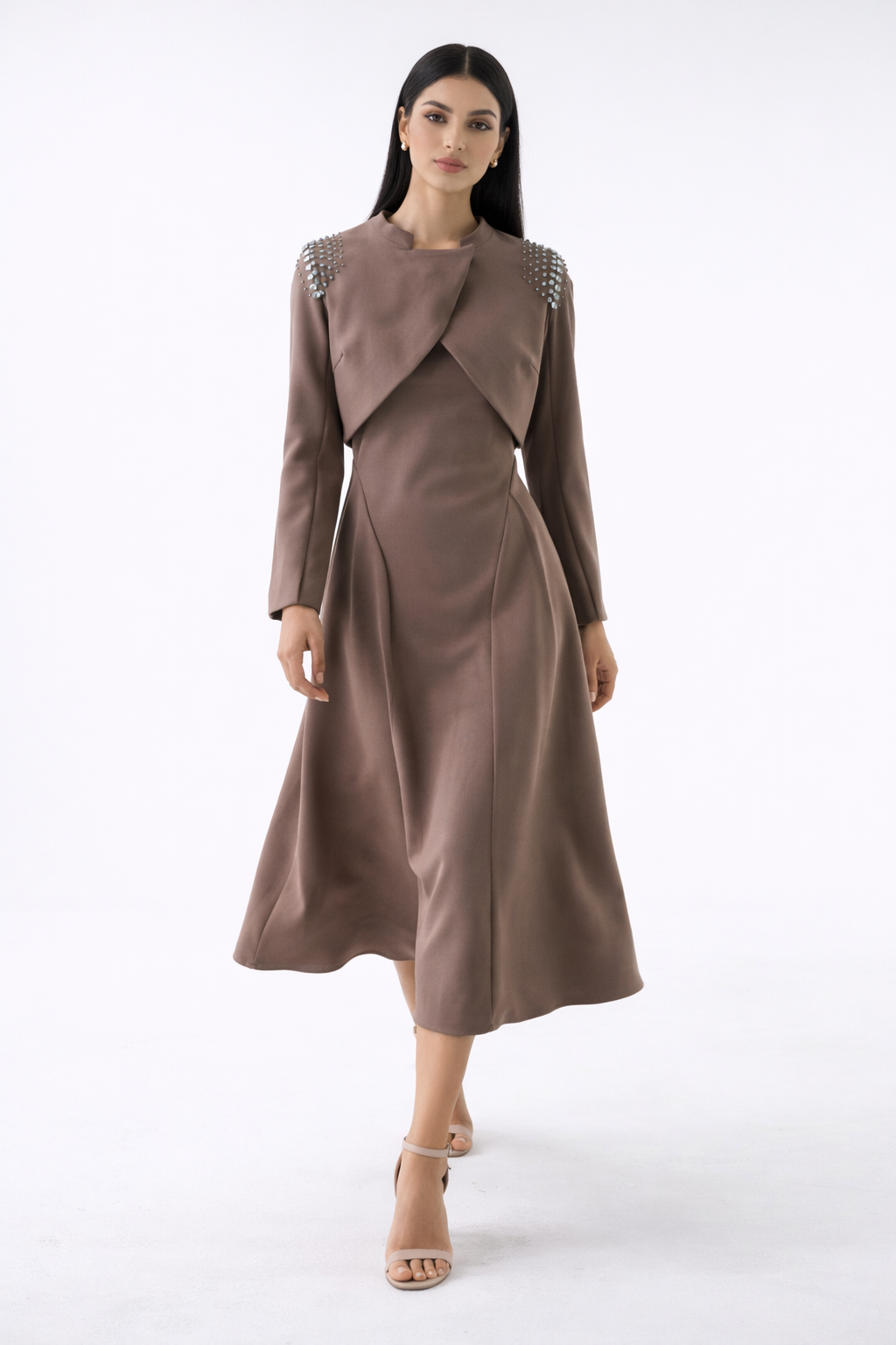 Style the Elara Embellished Trim Midi Dress with neutral or pastel heels for Ramadan evenings. For Eid celebrations, pair it with the coordinating jacket 2596002, minimal jewelry, and a structured clutch for a polished festive look.