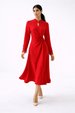 Designed for refined Ramadan gatherings and elegant Eid occasions, this graceful maxi dress blends timeless modesty with modern femininity. The design features a clean stand collar with a subtle keyhole opening, finished with a fabric-covered button for a polished neckline detail. A softly sculpted twist detail at the waist creates elegant draping across the bodice, enhancing the silhouette while maintaining fluid movement. Long sleeves are accented with delicate lace-trimmed cuffs and fabric-covered buttons, adding a romantic handcrafted touch. The flared hemline flows beautifully with every step, making this piece both sophisticated and effortlessly wearable.