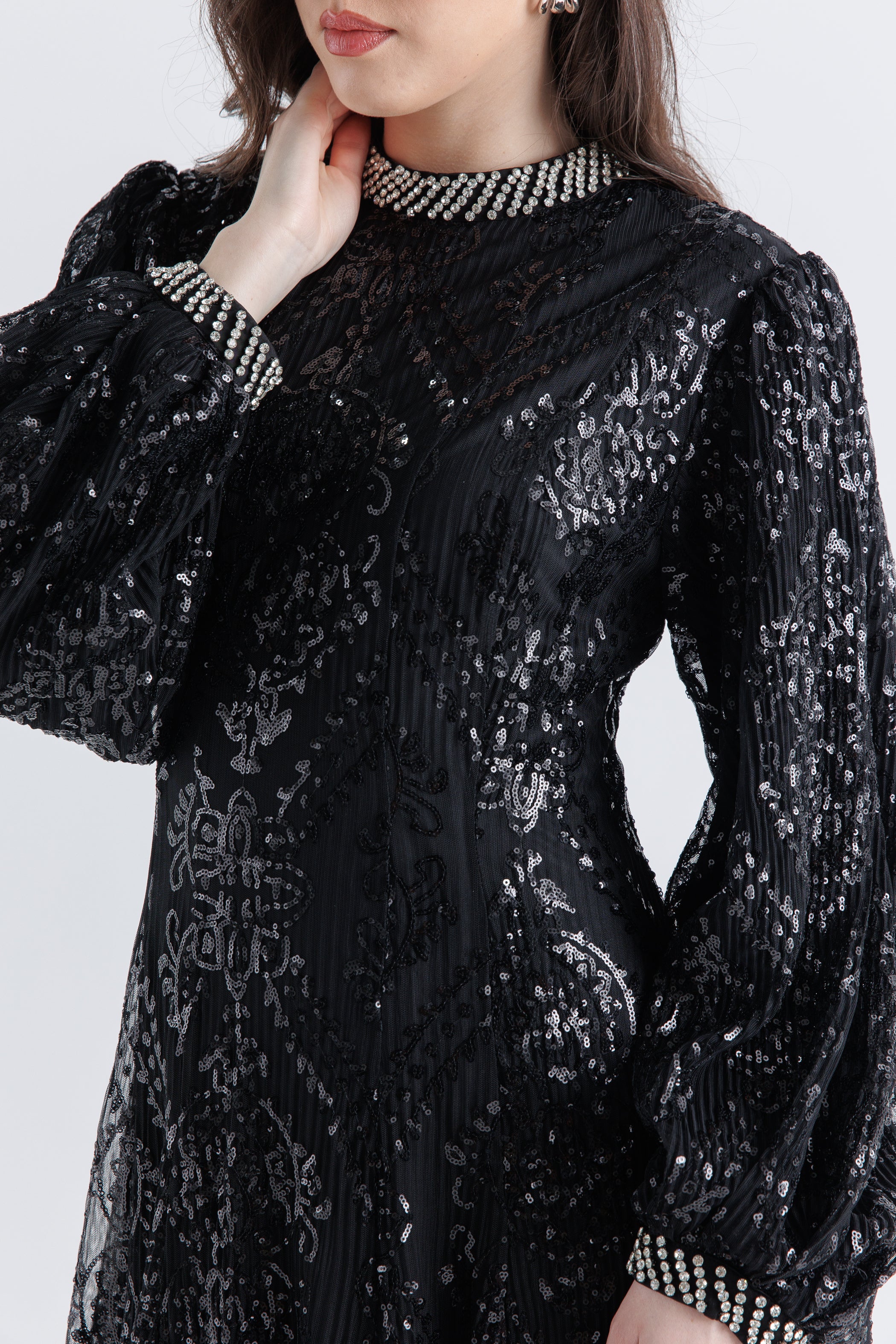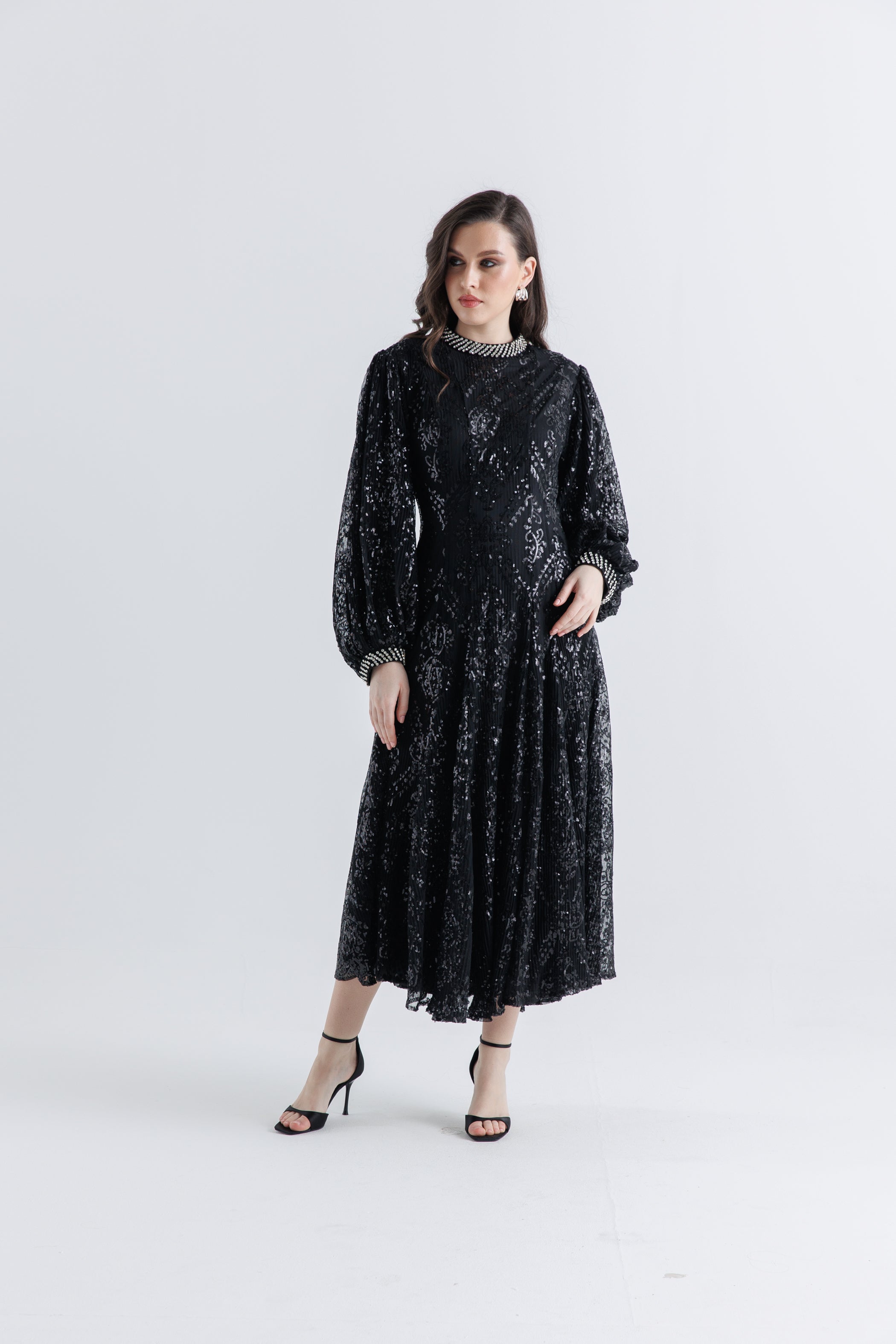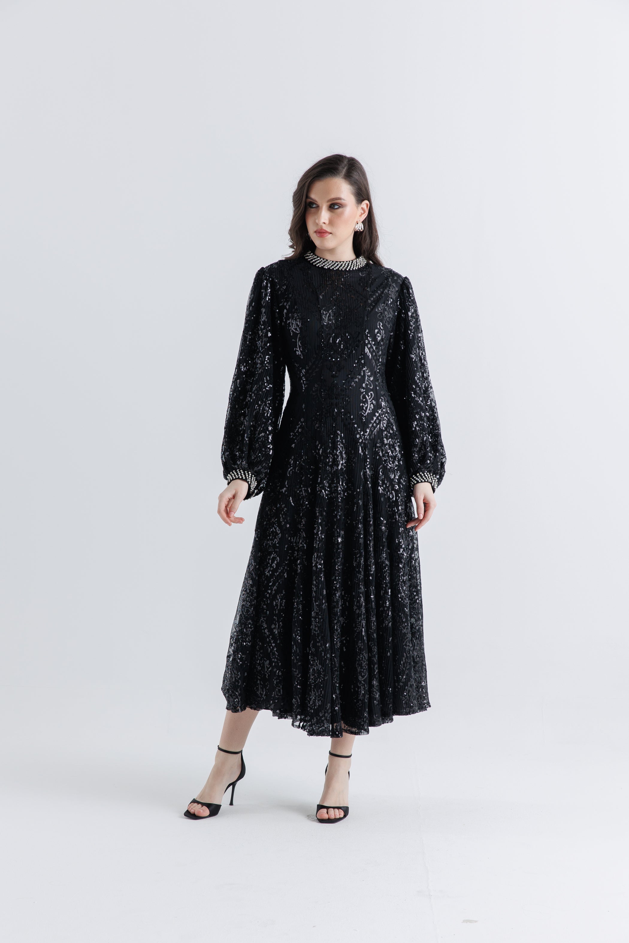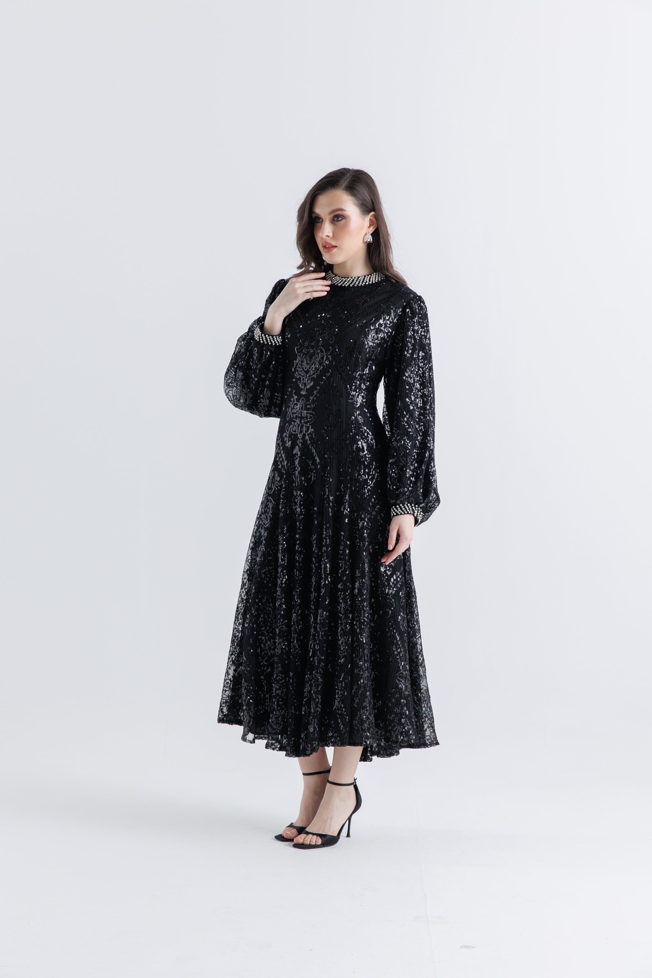 Shine effortlessly in the Radiant Elegance Sequin Maxi Dress, a 130 cm flowing masterpiece perfect for Ramadan, Eid, and grand celebrations. Designed with a high neckline and voluminous balloon sleeves, this dress exudes elegance with its fitted waist and intricate sequin embroidery on delicate mesh fabric. The embellished neckline and cuffs add a luxurious touch, while the back zipper with hook closure ensures a secure and refined fit.