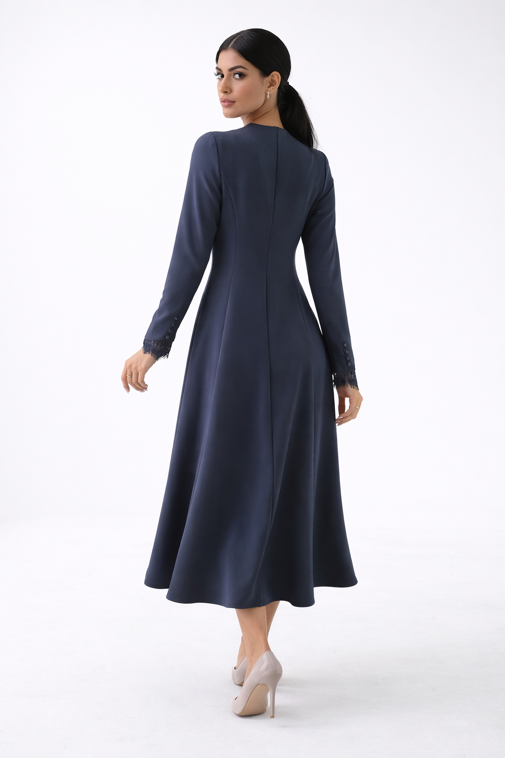 Designed for refined Ramadan gatherings and elegant Eid occasions, this graceful maxi dress blends timeless modesty with modern femininity. The design features a clean stand collar with a subtle keyhole opening, finished with a fabric-covered button for a polished neckline detail. A softly sculpted twist detail at the waist creates elegant draping across the bodice, enhancing the silhouette while maintaining fluid movement. Long sleeves are accented with delicate lace-trimmed cuffs and fabric-covered buttons, adding a romantic handcrafted touch. The flared hemline flows beautifully with every step, making this piece both sophisticated and effortlessly wearable.