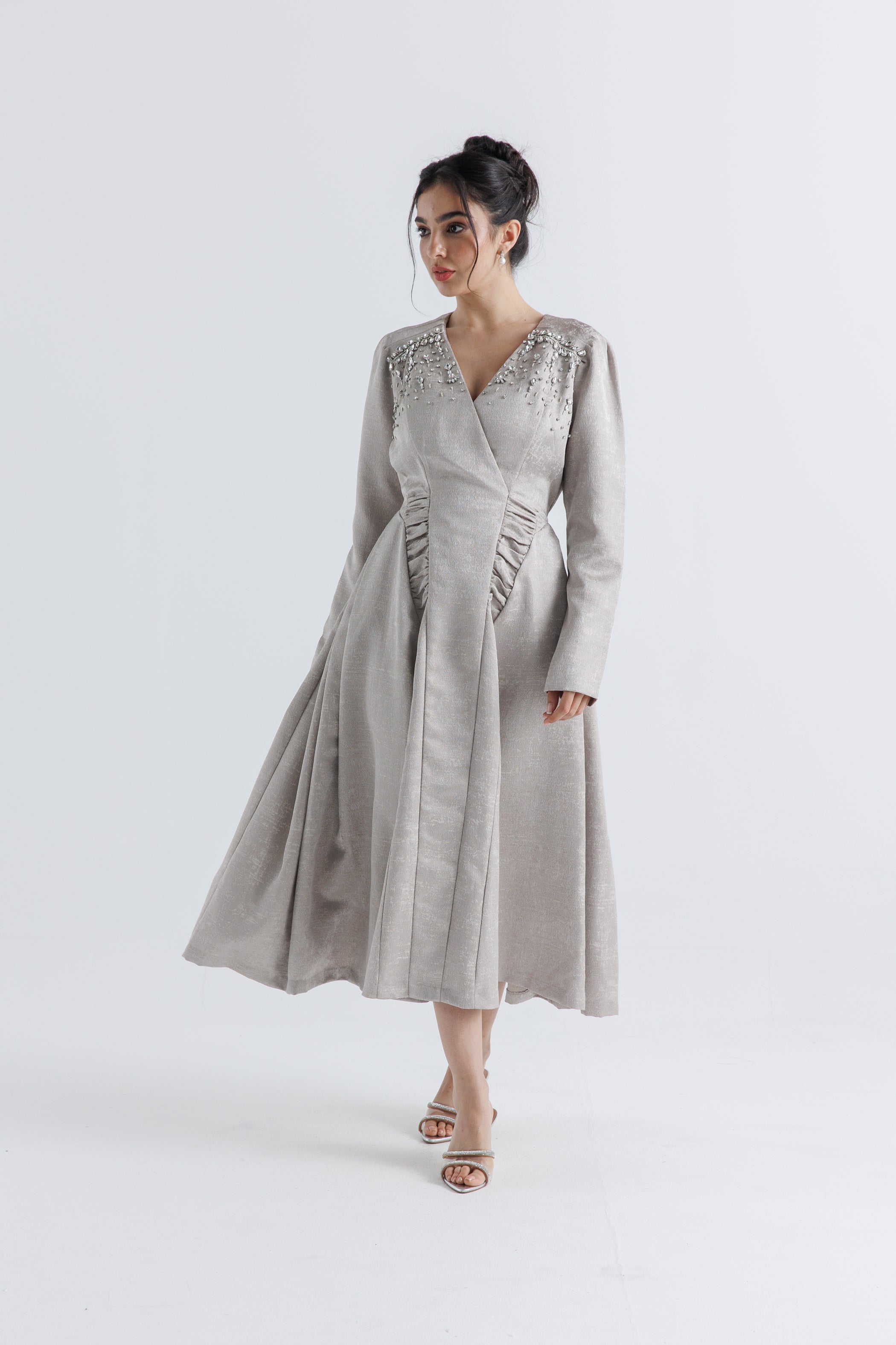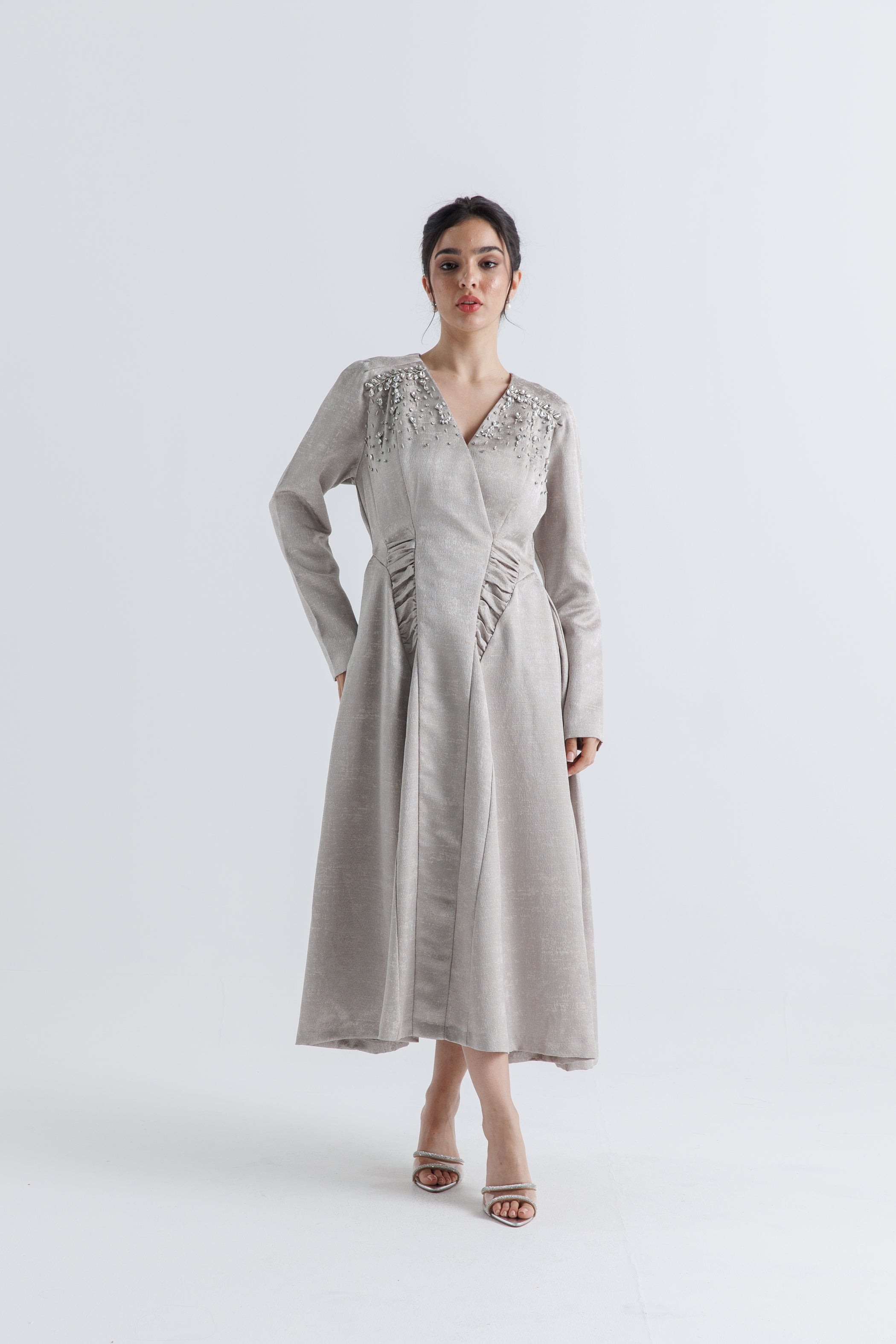 Step into effortless elegance with the Opulent Charm Embellished Midi Dress, a 120 cm masterpiece designed for Ramadan, Eid, and festive occasions. Featuring a fixed wrap-style front, a flattering V-neckline, and structured long sleeves, this dress offers a refined yet modern silhouette. The exquisite hand-applied embellishments on the shoulders add a touch of luxury, while the pleated waist detail enhances the feminine fit. Designed for both elegance and functionality, this dress also includes side pockets for added convenience. Crafted from a premium jacquard blend with a subtle sheen, it exudes timeless sophistication.