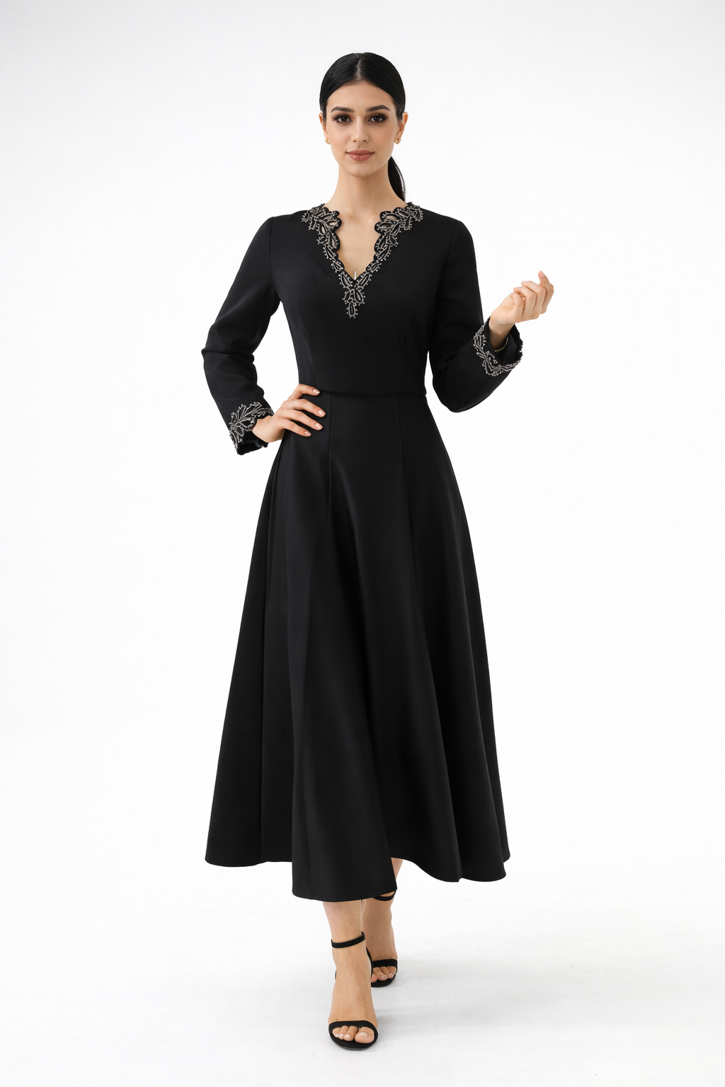 The Elara Flow Midi Skirt pairs effortlessly with fitted tops, embellished blouses, or minimalist tanks for a refined Ramadan look. For a coordinated and elevated ensemble, pair it with style 2595012 to create a sophisticated Eid-ready outfit. Complete the look with classic pumps or heeled sandals and delicate accessories.