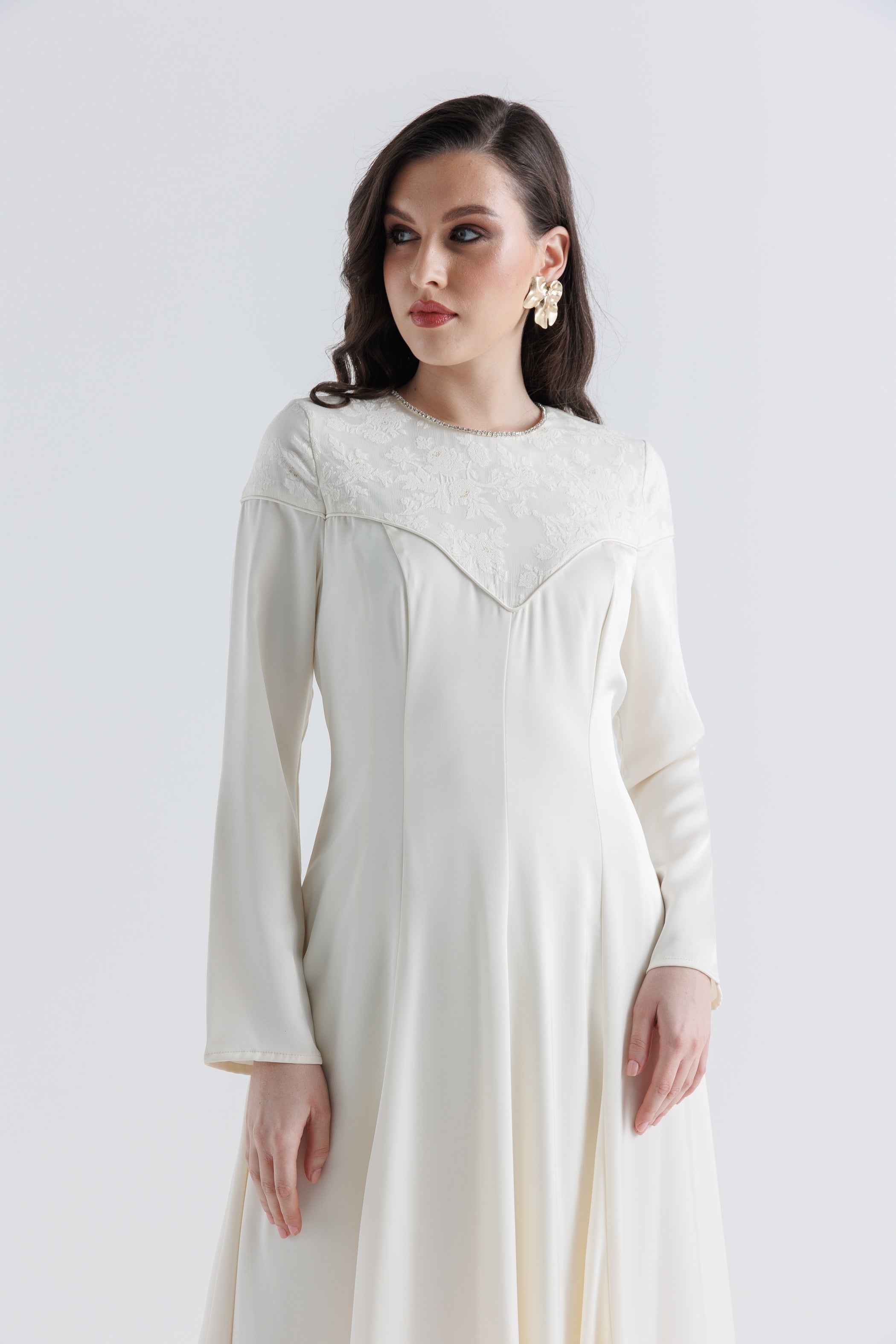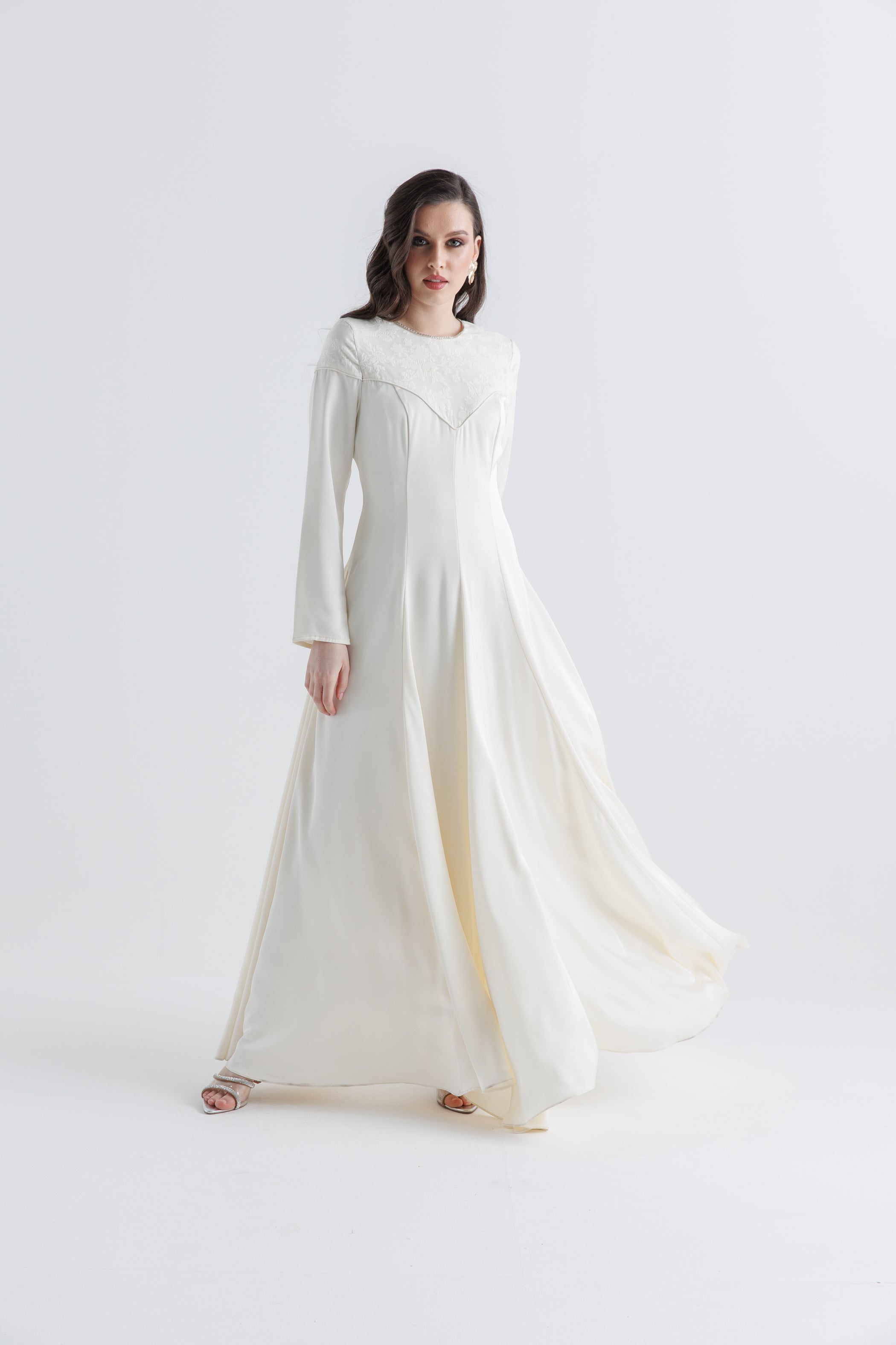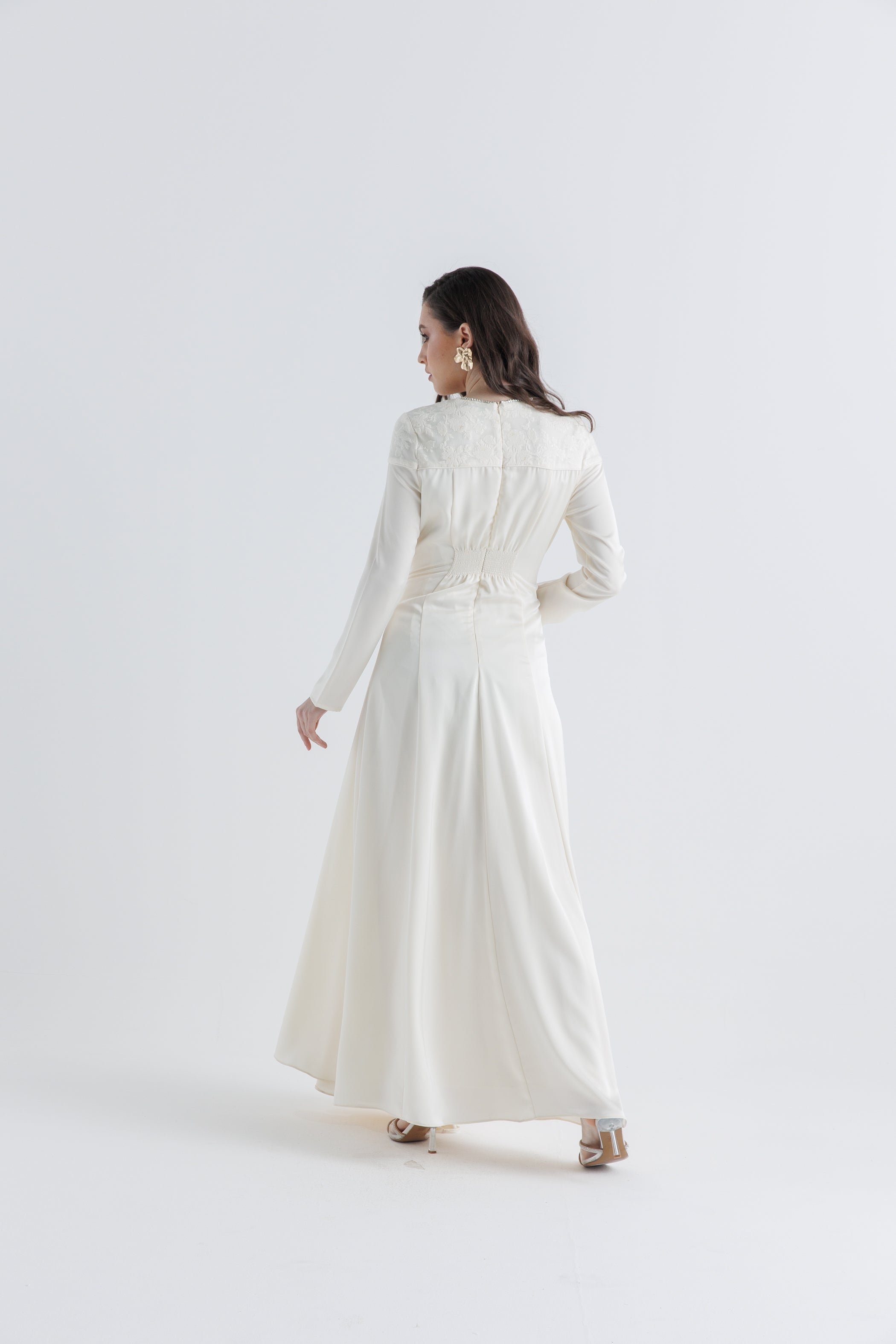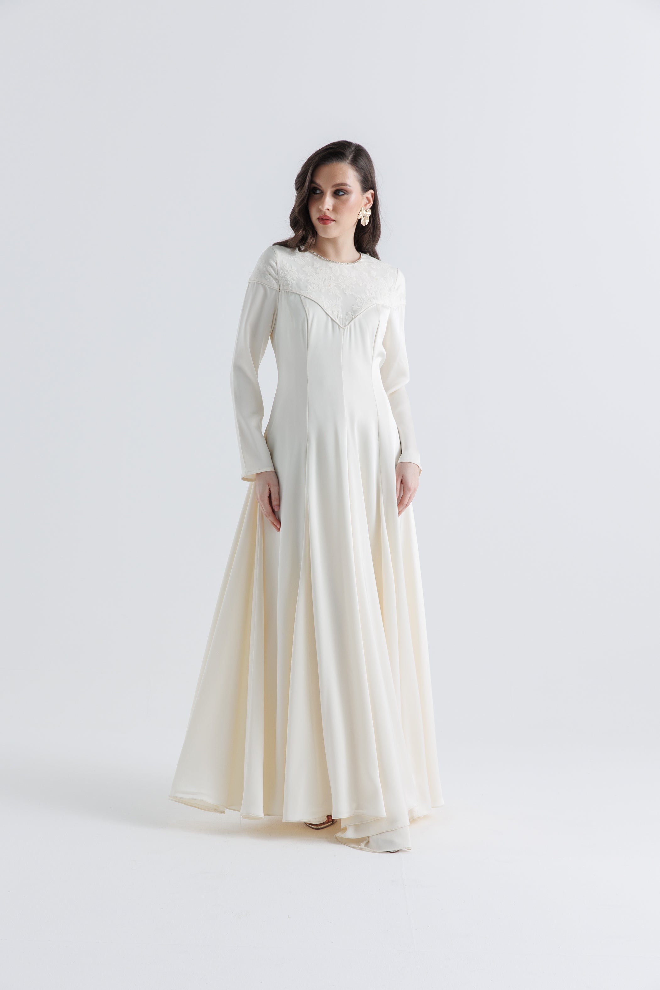Gracefully timeless, this A-line maxi dress exudes refined elegance with its flowing silhouette and delicate lace detailing. The bodice features an intricately embroidered lace yoke with soft shimmer accents, complemented by a curved seam that enhances the feminine form. Fully lined for comfort and coverage, the dress falls into a fluid full-length skirt, ideal for formal occasions, evening gatherings, or elevated daywear.